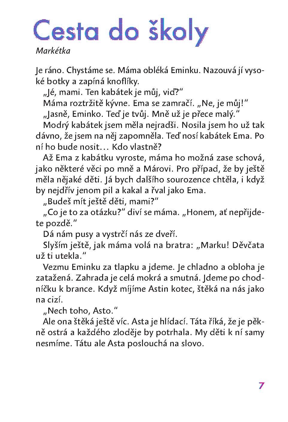 Dvacet devět miniaturních příběhů vyprávěných střídavě desetiletou Markétkou, osmiletým Markem neboli Márou a tříletou Eminkou – také 2 psem – provede malé čtenáře napříč rokem od podzimu do léta a událostmi v rodině, jak se přihodí a plynou (Cesta do školy, Zima, Smutek, Láska, Dárek, Štestí, Čím budu, Až mi bude sedmdesát...). Hřejivé příběhy s vtipnými dětskými postřehy navozují pocit bezpečí, jistoty a pohody, přesně to, co mnohým dnešním dětem chybí. Dětští protagonisté, jejich problémy i radosti všedního dne jsou přímo pobídkou ke srovnávání nebo ztotožnění dětského čtenáře s hrdiny knížky. Kouzlo autorčina vyprávění však chytí i dospělého čtenáře – doporučujeme zvláště rodičům s malými dětmi!