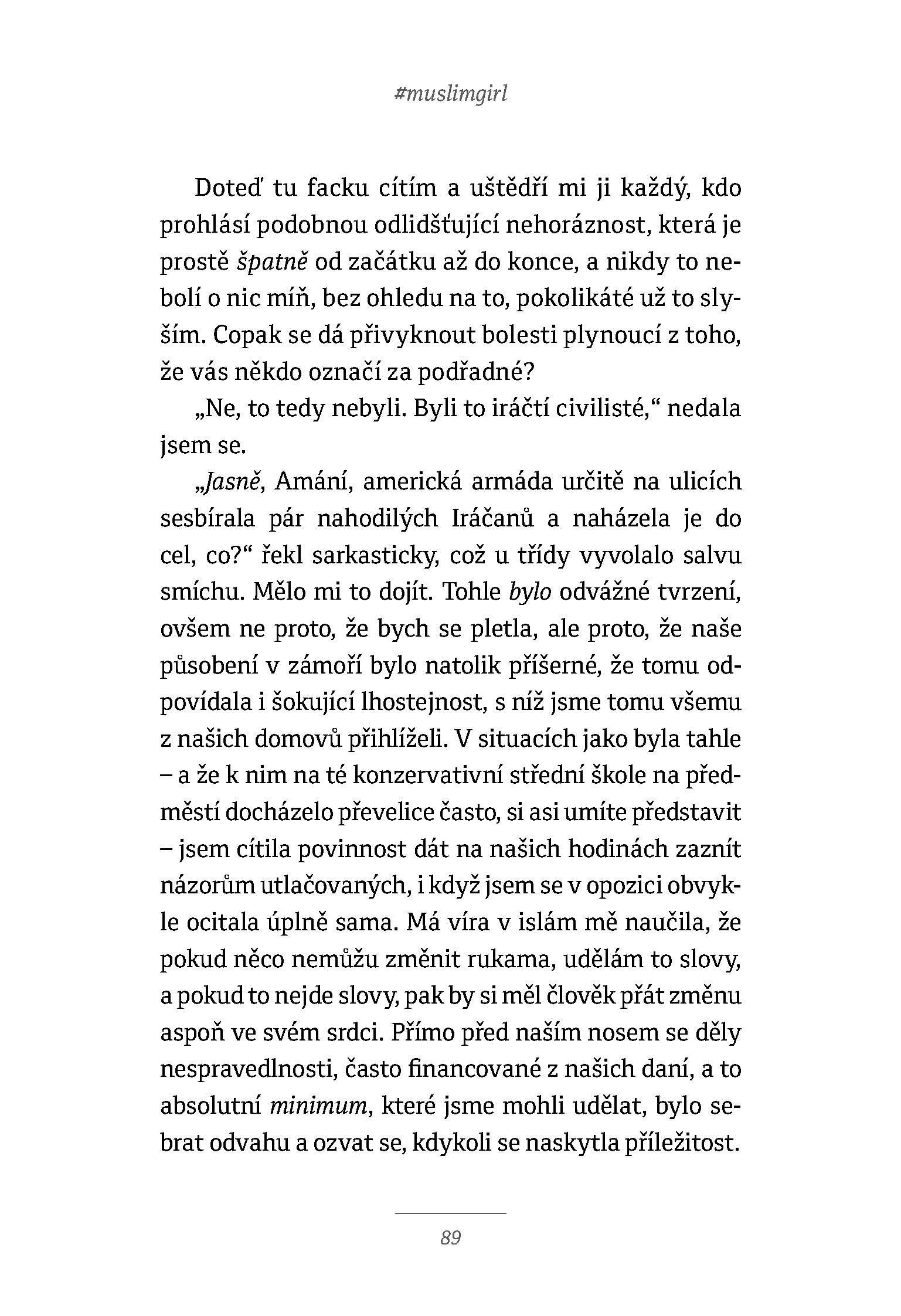 Kniha od zakladatelky webu MuslimGirl.com vypráví o nelehkém dospívání, které zažívala jako americká muslimka v období po 11. září, během nekonečné války proti terorismu a v éře Trumpova příležitostného rasismu. Z webového projektu MuslimGirl.com se stal kulturní fenomén a v současnosti se k němu upíná pozornost značné části internetového světa.