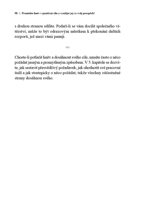 Hněv, vztek, zuřivost – ať už použijeme jakýkoli výraz – je emocí, patřící ke každé lidské bytosti. Tak jako u ostatních emocí existuje dobrý důvod, proč jsme schopni hněvu. Někdy je dobré se rozzuřit. Když čelíte nějaké opravdu frustrující skutečnosti, je nejužitečnější se zamyslet nad tím, jak svou zlobu využijete: potlačíte ji, anebo najdete způsob, jak ji využít ve svůj prospěch? Hněv je něčím, co vnímáte, co oprávněně prožíváte tváří v tvář nespravedlnosti. Zpracování hněvu a jeho proměna v pozitivní výsledek je procesem, který sestává z mnoha kroků. Prvním krokem je rozhodnutí, zda je vztek vůbec oprávněnou reakcí na nějakou situaci. Pokud tomu tak není, kniha vám napoví, jaký by měl být váš správný pocit a následný postup.