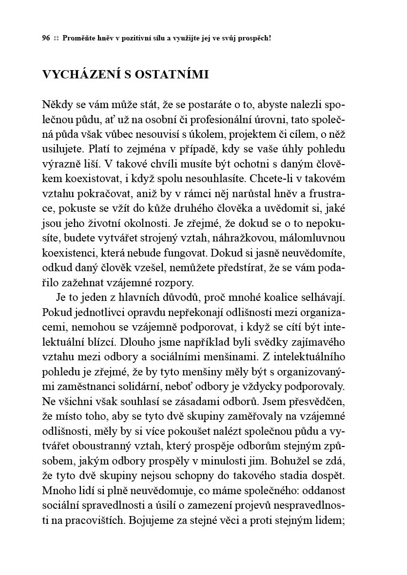 V dnešním světě panuje více hněvu než dříve. Jsme rozprostřeni do milionu různých směrů, a přesto je dnešní svět menší, propojenější a naše vztahy se rychle mění. Byli jsme zvyklí konkurovat firmám, sídlícím ve stejné budově nebo zemi; dnes však musíme uvažovat o globální ekonomice. Sociální sítě se staly platformami, umožňujícími komukoli cokoli demokraticky vyjádřit, což je pozitivní. Obrovské množství takových projevů, nefiltrovaný obsah a anonymita, kterou tyto platformy umožňují, nicméně vytvářejí komnaty ozvěn, ve kterých se pocity hněvu a ublíženosti zesilují. Tento stres může vést k emocionální reakci, a někdy volíme raději vztek než jiné emoce, abychom nepůsobili zranitelným dojmem. Často používáme hněv jako obranný mechanismus, který nám pomáhá překonat každodenní bitvy. S tím, jak náš hněv narůstá, však ztrácíme schopnost spolupracovat – dosahovat společenských změn nebo spolu prostě vycházet na pracovišti. Taková zloba nás může vzájemně izolovat. Ať už jde o nalezení společných zájmů, překonání odlišností nebo o schopnost naslouchat, aniž by hněv filtroval to, co slyšíme, je třeba umět proměnit jakoukoli situaci ve vítězství. A přesně o tom je tato kniha.