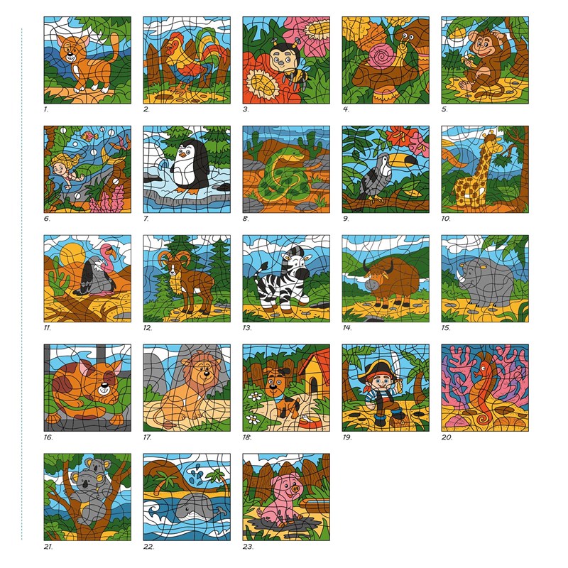 Co je to za podivné čáry? Na první pohled nedávají smysl, ale když povoláš do služby pastelky a vybarvíš jednotlivá políčka správnými barvami, vykouknou na tebe roztomilá zvířátka. Dokážeš je všechna pojmenovat? A najdeš dva obrázky, kde jsou místo zvířátek schované pohádkové postavičky?