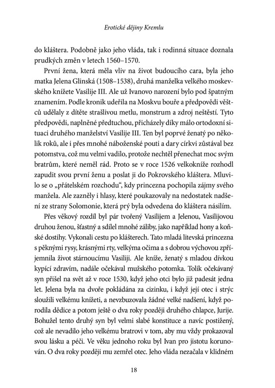 Erotické dějiny Kremlu nabízejí putování do nitra jednoho z nejtajemnějších míst moci na světě, kde se po staletí setkává politika s intimitou. Jejich cesty se kříží a vzájemně obohacují. Provází nás od šesti žen Ivana Hrozného až k prvním dámám, jakými byly Nina Chruščovová, Viktorie Brežněvová a Raisa Gorbačovová. Samostatnou kapitolou je „rudý Kreml“ s požitkářem Leninem, ohnivou Alexandrou Kollontajovou, velkou vyznavačkou volné lásky, a se Stalinem, který se snažil, aby ženy zmizely. Kniha přináší zástup osobností jak z ruských románů, velké milostné příběhy i příběhy nenávisti, zachycuje nejrůznější manželské vztahy, mravy skrývané i okázale předváděné, úskoky i boje na život a na smrt.