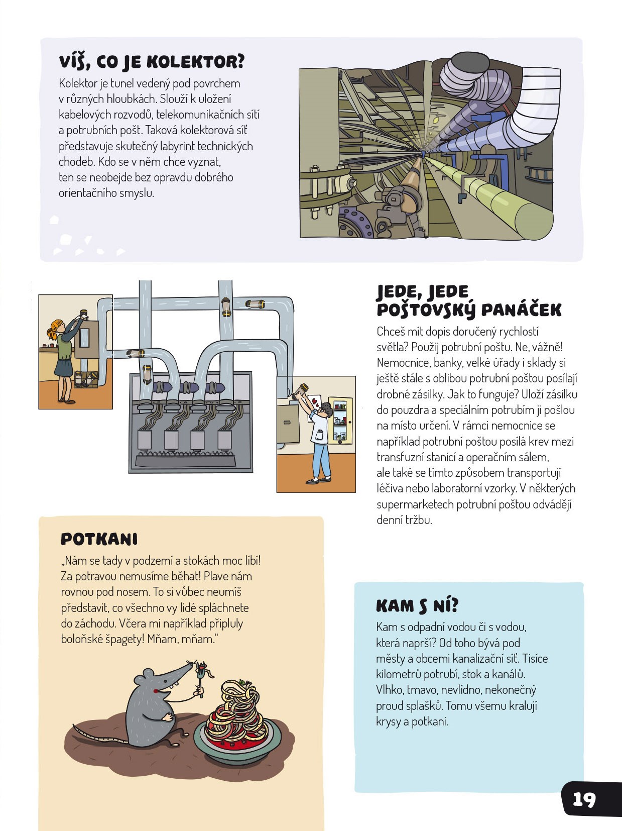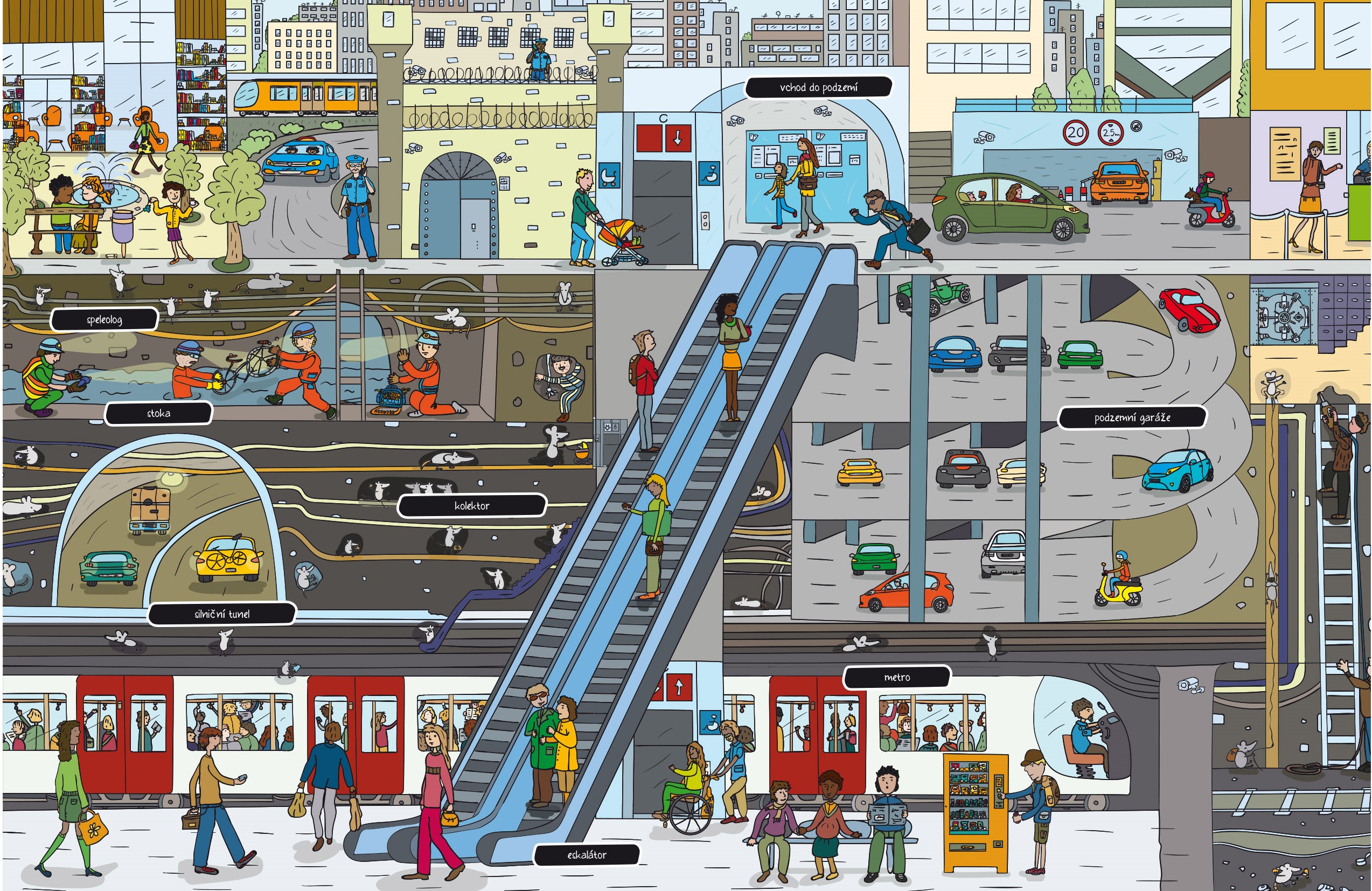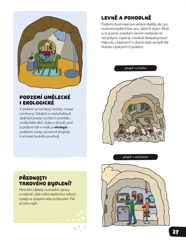 Lidé parkují a nakupují, sportovci cvičí, plavou, milovníci umění si prohlížejí obrazy. Vážně, já si nevymýšlím! V podzemí není žádná nuda, tam to žilo, žije a ještě žít bude! Pokud nevěříš, tak se mnou sestup dolů...níž a ještě níž, až k samotnému jádru. Budeš mít dost odvahy?…Hrozí, že se ti tu zalíbí a nebudeš chtít ven. Nádherné ilustrace, systém rozkládacích chlopní a podrobné informace ze světa pod nohama ti zamotají hlavu. Jen pozor, ať si neumažeš prsty od hlíny.
