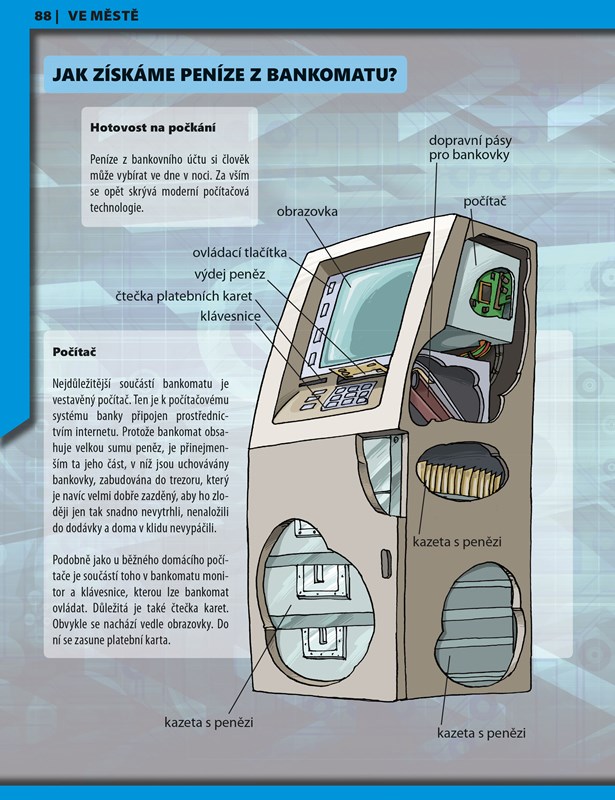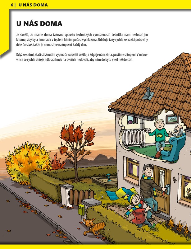 Bez moderních technologií se v našem světě již neobejdeme – najdeme je všude kolem nás. V kapitolách „U nás doma“, „Volný čas“, „Komunikace“, „Vozidla“ a „Ve městě“ postupně přijdete na kloub principům fungování počítače, telefonu, auta, eskalátoru, výtahu apod. Velmi nápomocny vám budou fotografie a podrobné ilustrace, které poskytují fascinující pohledy do útrob všech těchto spotřebičů, zařízení a strojů.
