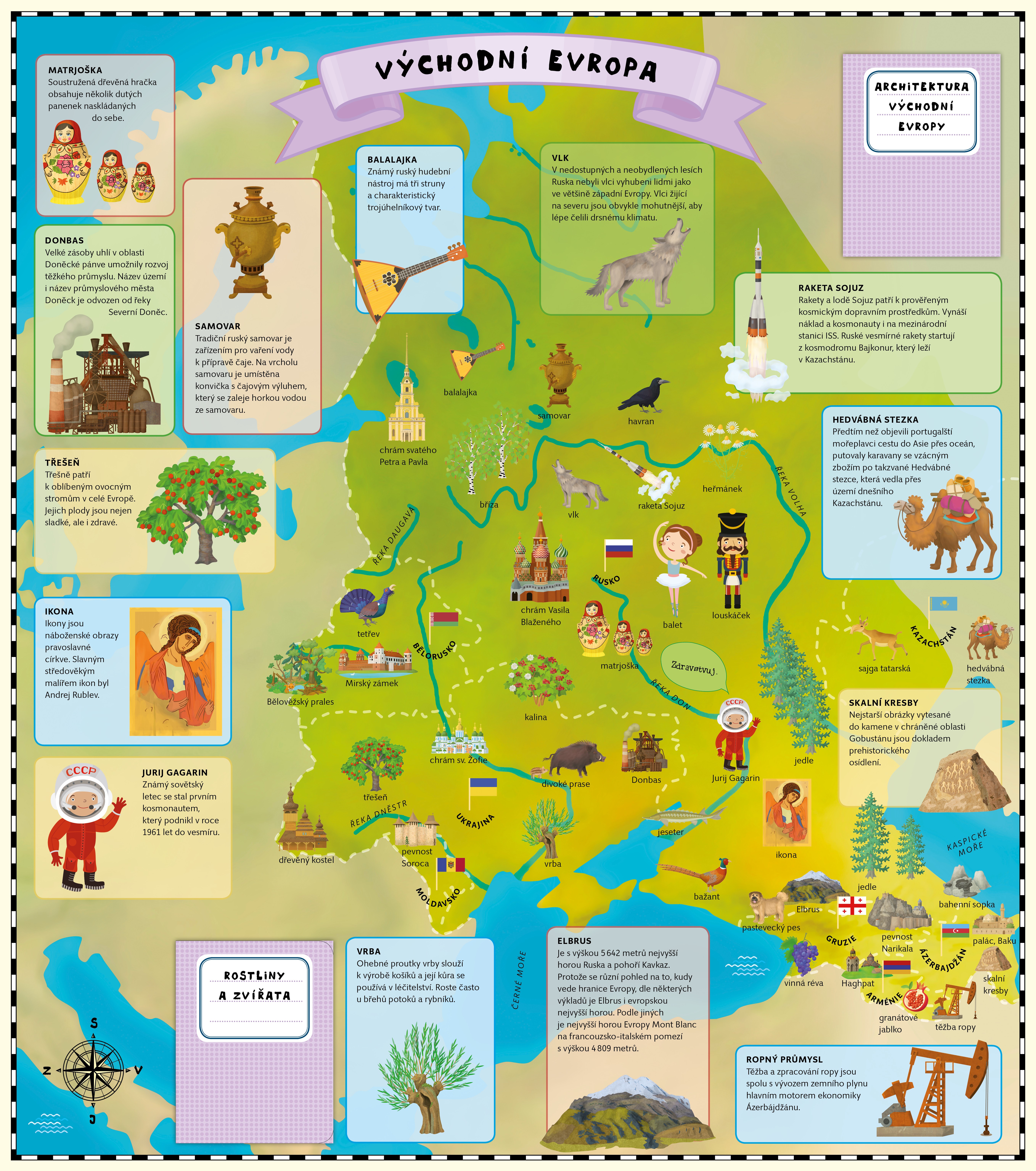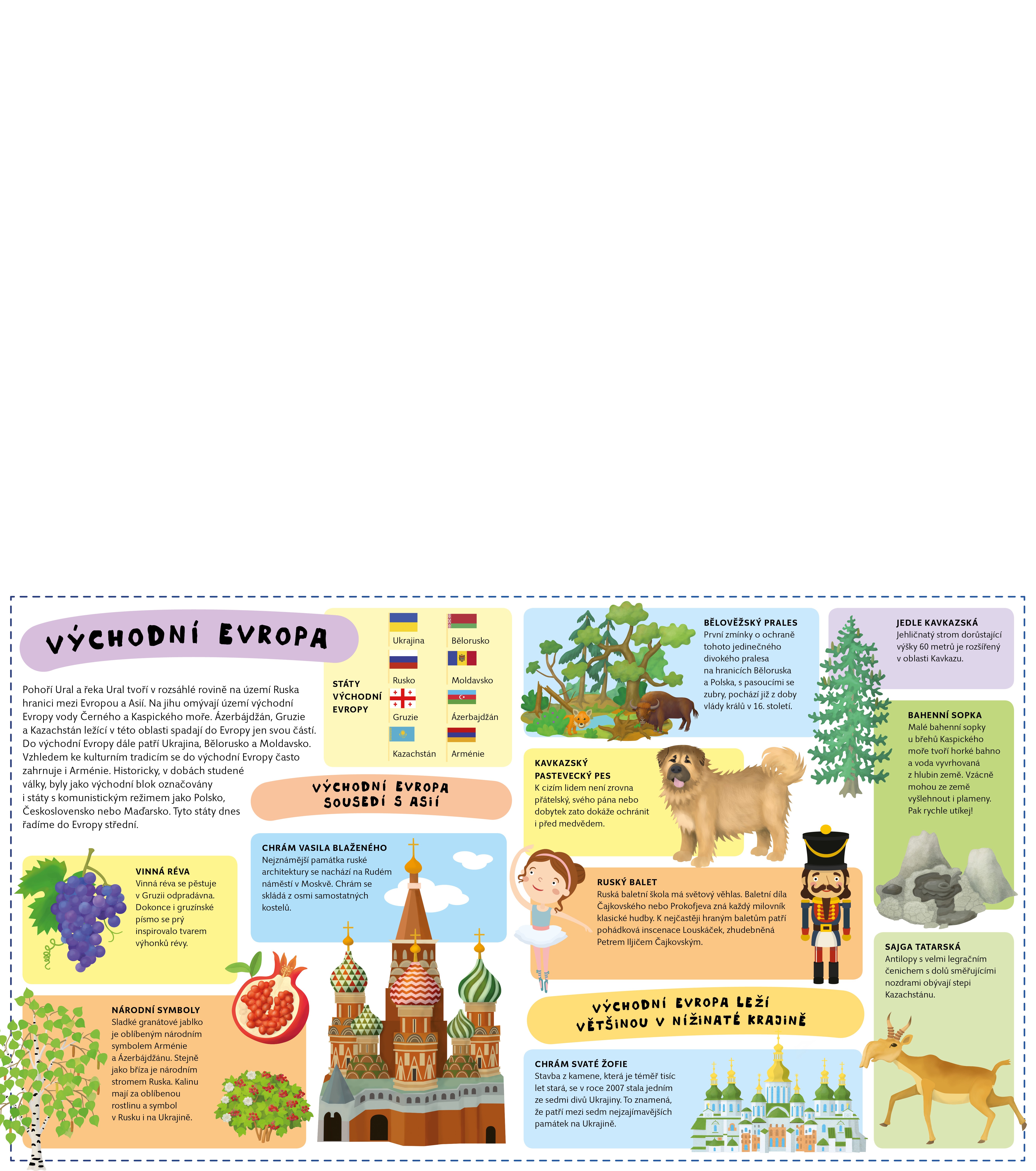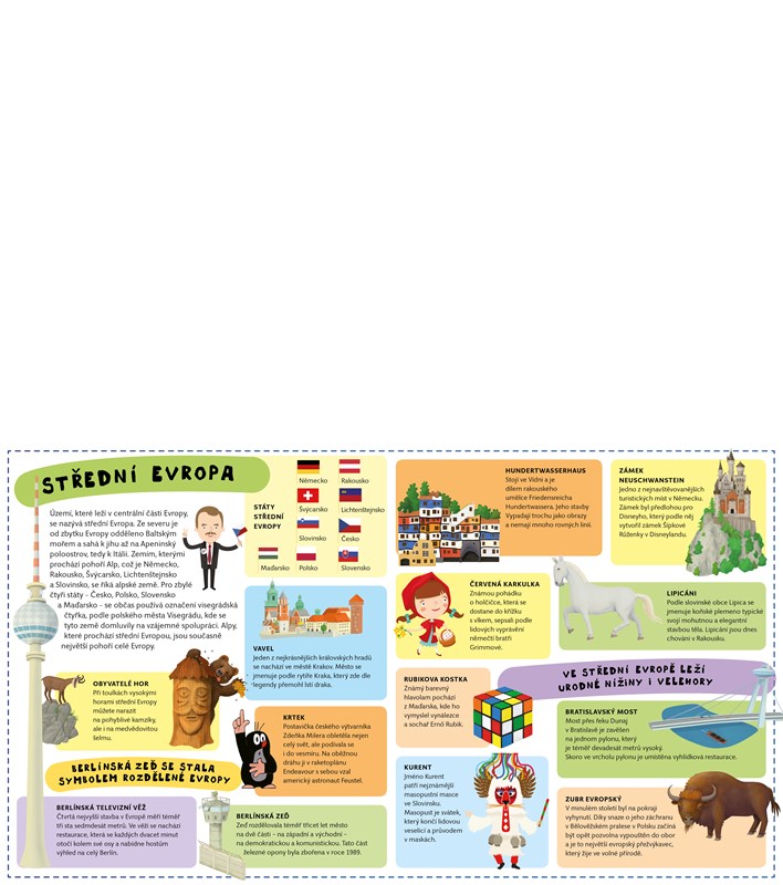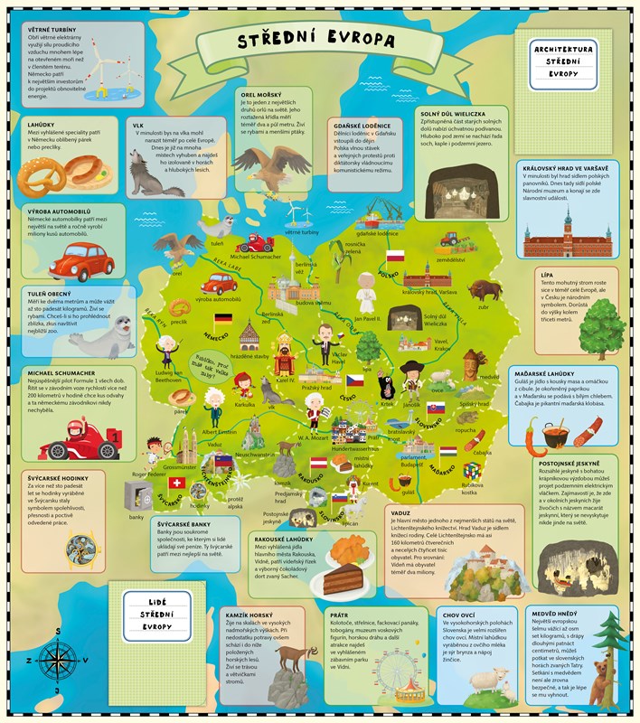 Evropa je sice druhým nejmenším světadílem, ale pokud jde o objevování zajímavostí, je přímo nevyčerpatelným zdrojem. V Evropě žije přes sedm set milionů obyvatel, kteří hovoří více než dvěma sty jazyky a tvoří přes padesát národů v padesáti různých státech. To už stojí za objevování. Vydej se s námi na pouť napříč celou Evropou od západu k východu a od severu k jihu v šesti velkých rozkládacích mapách plných pozoruhodností. O každé zemi se něco dozvíš, v každém státě chvíli zůstaneš. Seznámíš se s evropskými osobnostmi historie i současnosti, poznáš nejzajímavější evropské stavby a přečteš si o zástupcích živočichů a rostlin z jednotlivých koutů Evropy. Nemusíš si ani balit kufr, stačí se jen pohodlně usadit a velké putování po Evropě může hned začít.