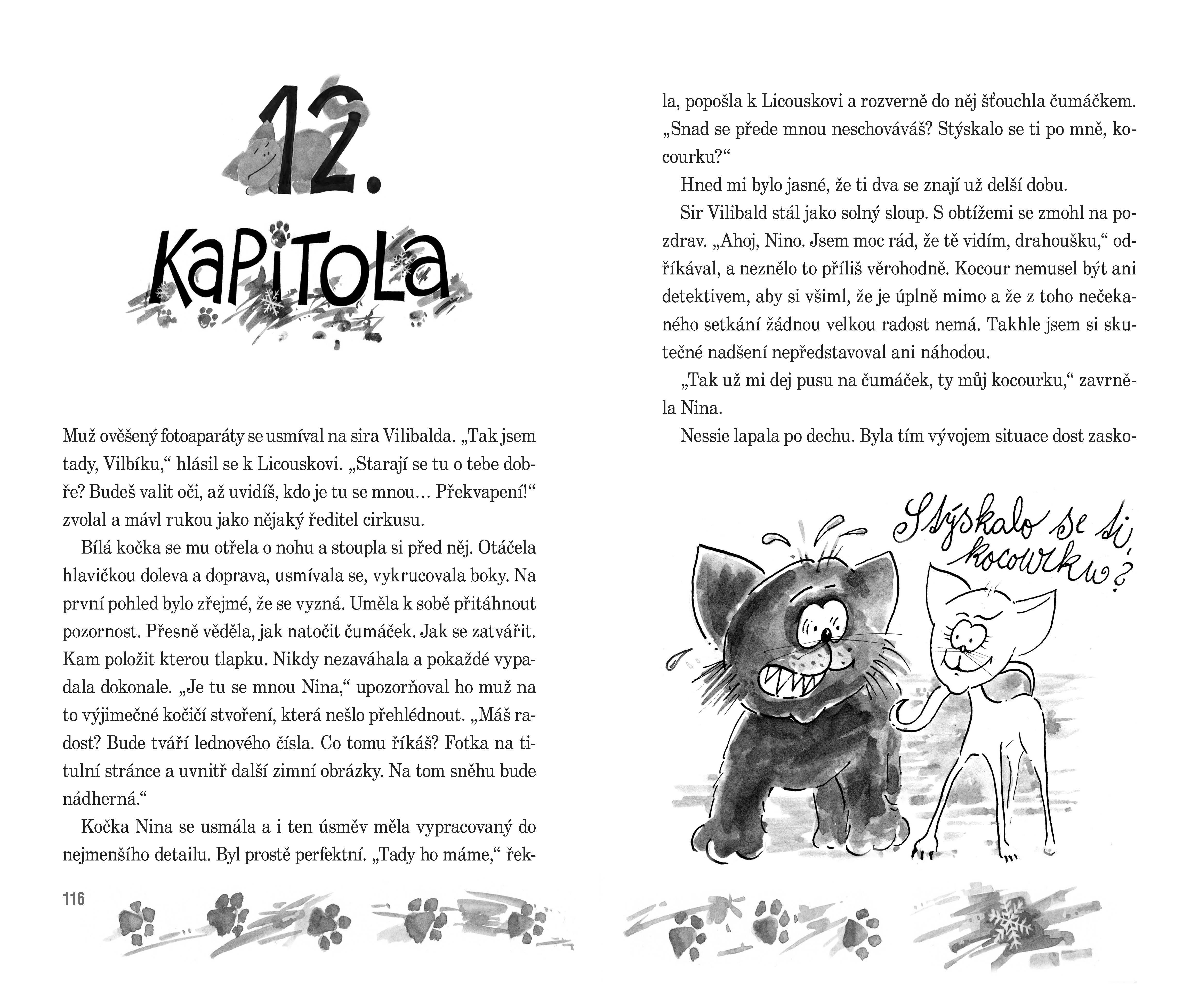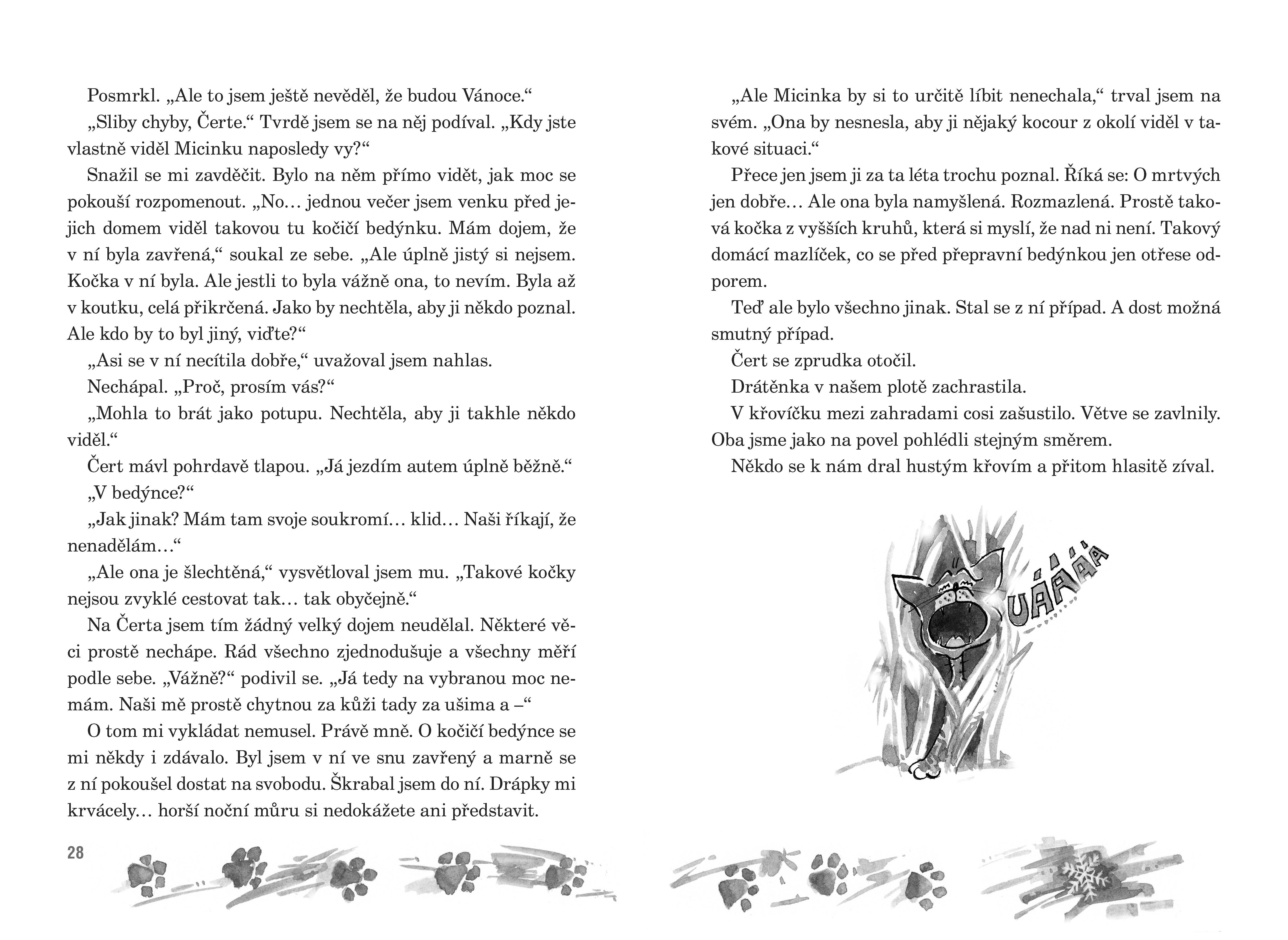 Všude po okolí visely plakátky s Micinčinou fotografií. Asi pocházela z nějaké důležité kočičí výstavy, protože se na ní tvářila děsně sebevědomě. Hlavu měla natočenou ke straně, aby vynikl její fotogenický čumáček. Kolem krku přehozenou červenou šerpu. Nessie říkala, že je na ní napsáno MISS. Tvrdila, že se to mezi kočkami dost cení. Asi jí trochu záviděla. A pod tím obrázkem byl zoufalý vzkaz.