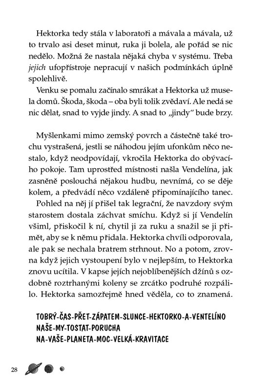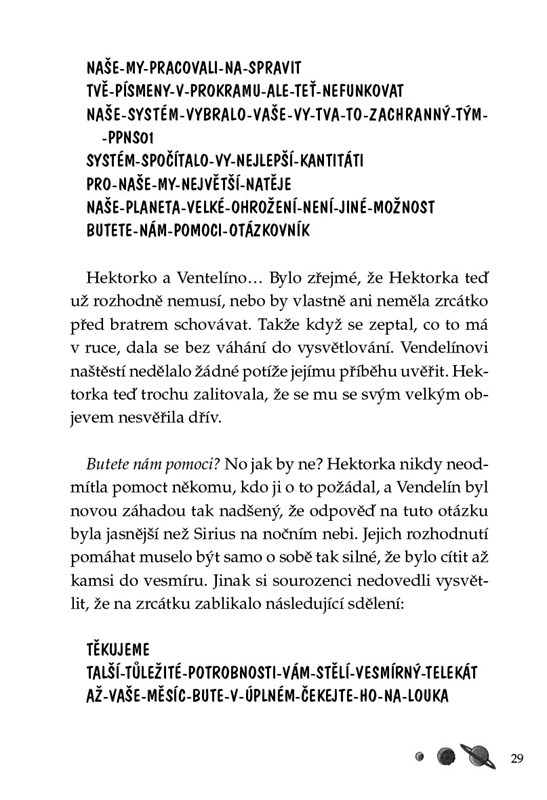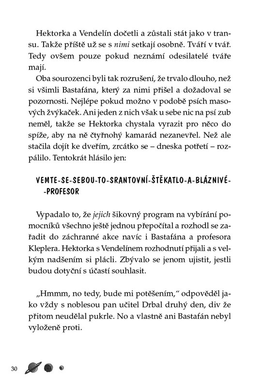 Hektorka je na první pohled nenápadná žákyně 6. A. Má neposedného mladšího bráchu Vendelína, ztřeštěného psa Bastafána a trochu pihatý nos. Jednoho dne najde Bastafán na louce podivné zrcátko. Ukáže se, že jde o dorozumívací zařízení, prostřednictvím kterého s nimi začnou komunikovat mimozemšťané. Proč? Jejich planeta je v ohrožení a oni vědí, že právě Hektorka, Vendelín, Bastafán a potrhlý fyzikář Drbal (přezdívaný také profesor Klepler) je můžou zachránit. Hektorka a Vendelín ani chvilku neváhají a spolu s Bastafánem a fyzikářem Kleplerem odlétají na malou fialovou planetku vstříc neobyčejnému dobrodružství.