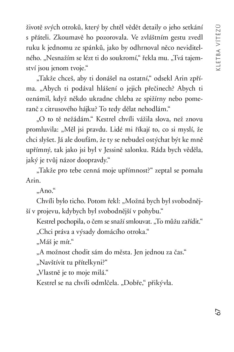 Když jednoho dne míjí na trhu místo, kde právě probíhá prodej otroků, upoutá její pozornost mladík hrdě vzdorující ponížení, kterému je vystaven. Kestrel se impulzivně pustí do dražby a vyhraje. Vítězstvím však na sebe přivolá kletbu, jejíž následky ji budou stát mnoho.