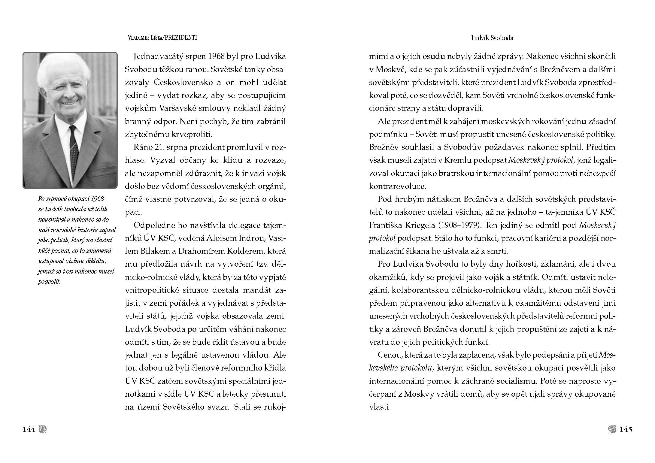 Jak prožívali svoji moc, ale i odpovědnost vůči občanům českoslovenští a čeští prezidenti? V čele naší republiky stálo za dobu její poměrně krátké existence jedenáct mužů, jejichž různorodé charaktery i schopnosti reflektují dějinné zvraty, kterým byl stát během své bouřlivé – nyní již staleté – historie vystaven. Prezidentský úřad byl vždy spojován s jistým majestátem, snad i proto, že ho zastávali přední politici, hrající – tu více, tu méně – úlohu arbitra i nejvýše postaveného reprezentanta naší republiky. Jací to byli lidé? Erudovaný historik a zkušený publicista Vladimíra Liška přináší osobitý pohled na hlavy našeho státu. Tato kniha však není souhrnem biografií, autor se zabývá především některými klíčovými, mnohdy dramatickými momenty jejich působení v prezidentském úřadu. Skutečné příběhy československých a českých prezidentů jsou v některých fázích napínavější než smyšlené historické thrillery.