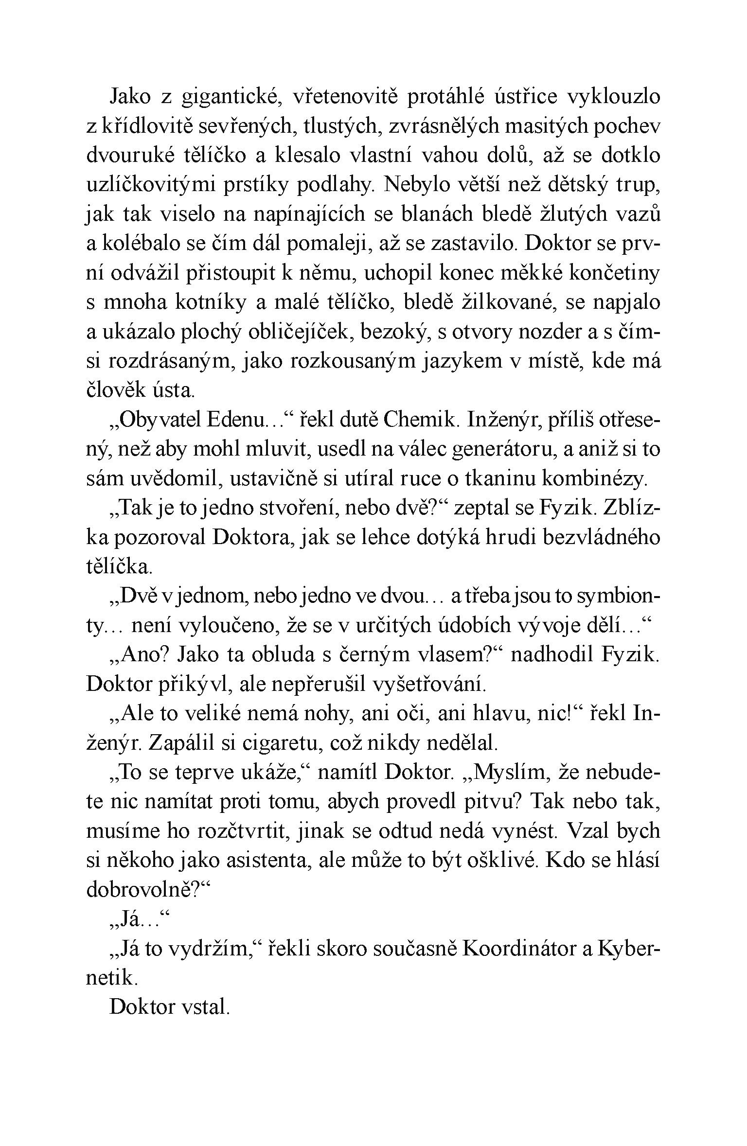 Když raketa se šesti astronauty – Koordinátorem, Inženýrem, Chemikem, Fyzikem, Kybernetikem a Doktorem – havaruje na dosud neprobádané planetě, jako zázrakem všichni přežijí. Během několika průzkumných výprav nacházejí známky civilizace, ovšem takové, která rajský Eden nepřipomíná ani zdaleka. Hrůzná opuštěná továrna, která vyrábí a zase ničí vlastní produkty, masový hrob, děsivé město… To vše v posádce lodi vyvolá dojem degenerované a trpící civilizace. Vše vyvrcholí, když se s jedním z „Edeňanů“ střetnou tváří v tvář… Před astronauty tak stojí zásadní otázka – mají zasáhnout ve prospěch utlačovaných, nebo se raději vyhnout otevřenému konfliktu a hledat cestu domů? Všichni členové posádky teď vědí, že mají v rukou osud celé jedné planety… -- Planeta Eden není jen příběhem o střetu lidské a cizí civilizace, je to také příběh obrovského morálního dilematu, kterému posádka čelí a které nemá správné řešení. Jak píše František Novotný ve svém doslovu,„V Planetě Eden se Stanisławu Lemovi poprvé podařilo na vědecké bázi skloubit klasické téma sci-fi se specifickými morálními problémy, jež by kontakt s mimozemšťany přinesl. Planeta Eden tak svým analytickým charakterem přesahuje nejen žánr sci-fi, ale rámec beletrie vůbec.“ – Přeložil Jaroslav Simonides.