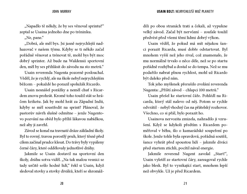 Pouhých 9,58 sekund – přesně tolik času zabrala Usainu Boltovi zářivá cesta na sportovní vrchol. Jeho světový rekord v běhu na sto metrů šokoval celý svět. Když byl ale Usain St. Leo Bolt malým chlapcem, víc než běhání, které ho vůbec nebavilo, se věnoval jiným sportům. Nebýt Boltova trenéra kriketu, možná by zůstal jeho talent bez povšimnutí. Nikdo, nejspíš ani Usain sám, tehdy ještě netušil, že tenhle vysoký, hubený kluk z malého městečka v oblasti Montego Bay na severním pobřeží Jamajky se jednoho dne stane nejrychlejším mužem planety.