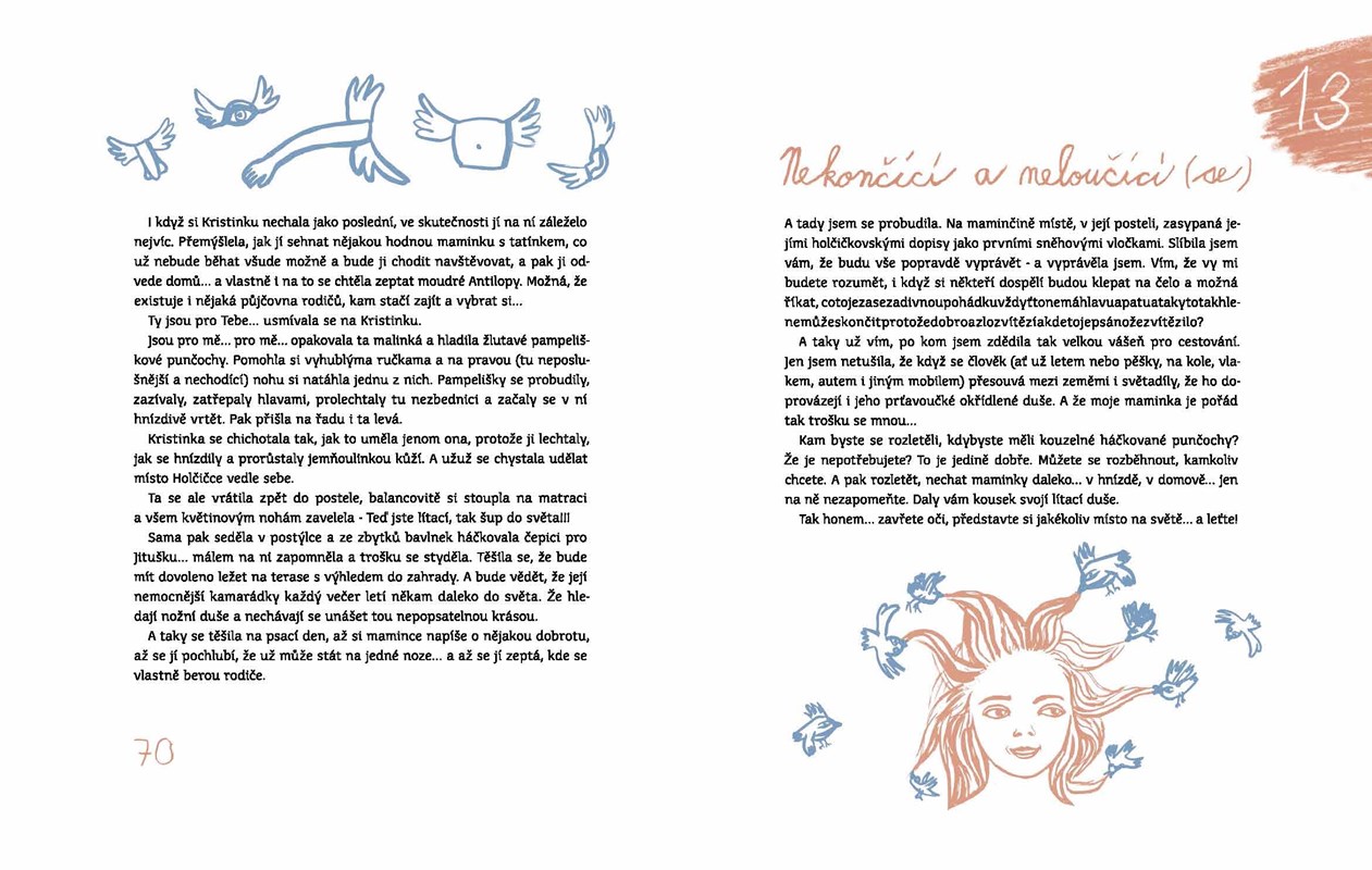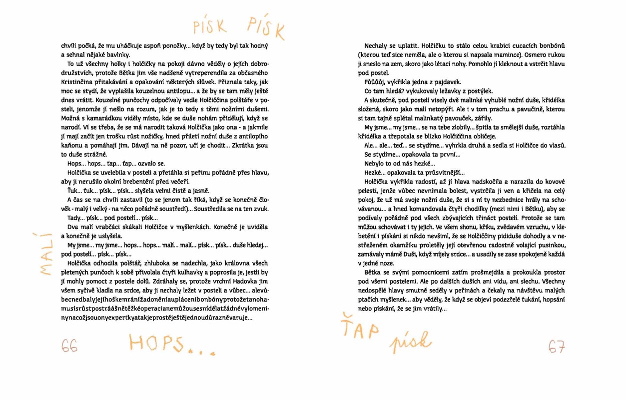 Jedno malé děvče, možná sama autorčina maminka, se tedy kdysi léčilo s bolavýma nohama. Špatně jí narostly, až jí skoro přestaly sloužit. Zdálo se dokonce, že nohy ztratily svou duši. Že jejich duše (každá noha má přece tu svou) kamsi uletěly. Nastane den, kdy je třeba jít do nemocnice. Holčička přesně neví, co jí je, a jazyk dospělých jí v tom moc nepomáhá. Nohy zkrátka neposlouchají. A nejsou v tom samy. Všude kolem jsou další děti, které něco bolí; nemůžou chodit, stát, nebo se dokonce hýbat. Co když je to všechno, ptá se holčička, způsobené tím, že nohám ulétly jejich nožní duše? A než se duše vrátí, nemohla by si z barevných bavlnek uháčkovat roztomilé, pohádkové punčochy, které by jí sloužily jako nové, zdravé nohy?