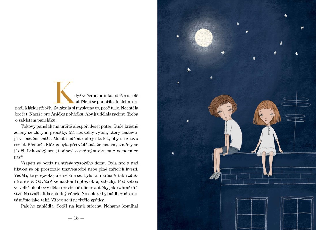 Veselá Klárka, která ráda sní, umí kreslit a vyprávět příběhy, se jednoho letního dne octne v nemocnici s vážnou chorobou. Snaží se nepropadnout smutku, naopak baví Aničku, která je s ní na pokoji a zprvu se na ni šklebí jako opice. Ve snu se Klárka setká s Martinem, a když zjistí, že ho ve skutečnosti srazilo na kole auto a on leží na nedaleké jipce, pomáhá mu k uzdravení. Její pomoc není však obyčejná… Zachrání Klárka kamaráda? A sebe?