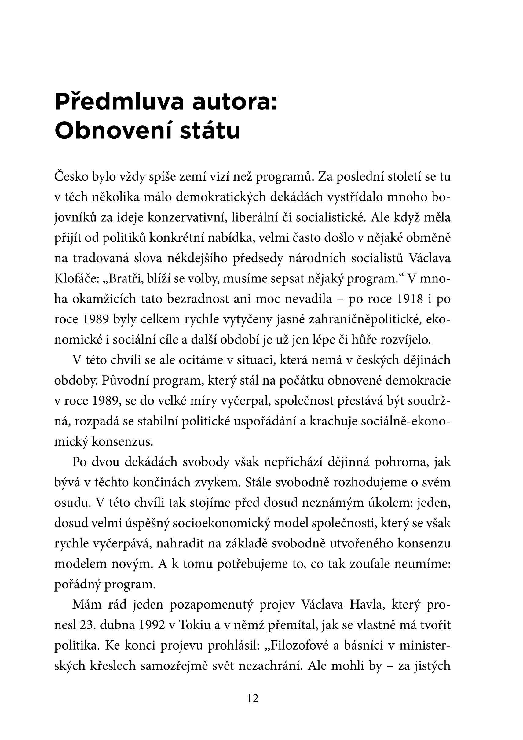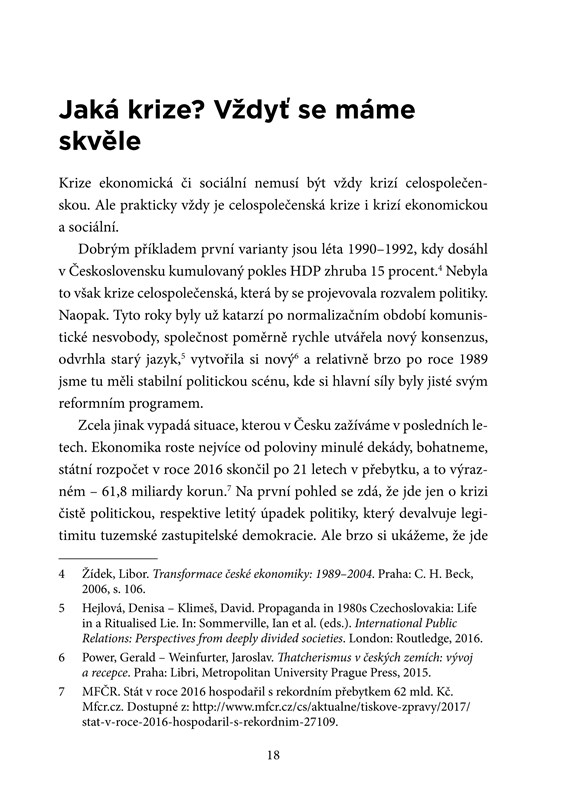 Česká společnost zažívá od roku 1989 nejúspěšnější a nejsvobodnější období své historie. Dosavadní sociální a ekonomický model však nevyhnutelně krachuje. Mylně si namlouváme, že za vše mohou neschopní politici a snažíme se je nahradit novými a neokoukanými. Za politickými krizemi ve skutečnosti číhá čím dál jasnější úpadek dosavadního polistopadového konsenzu.