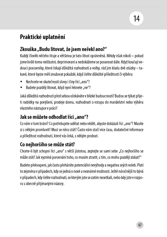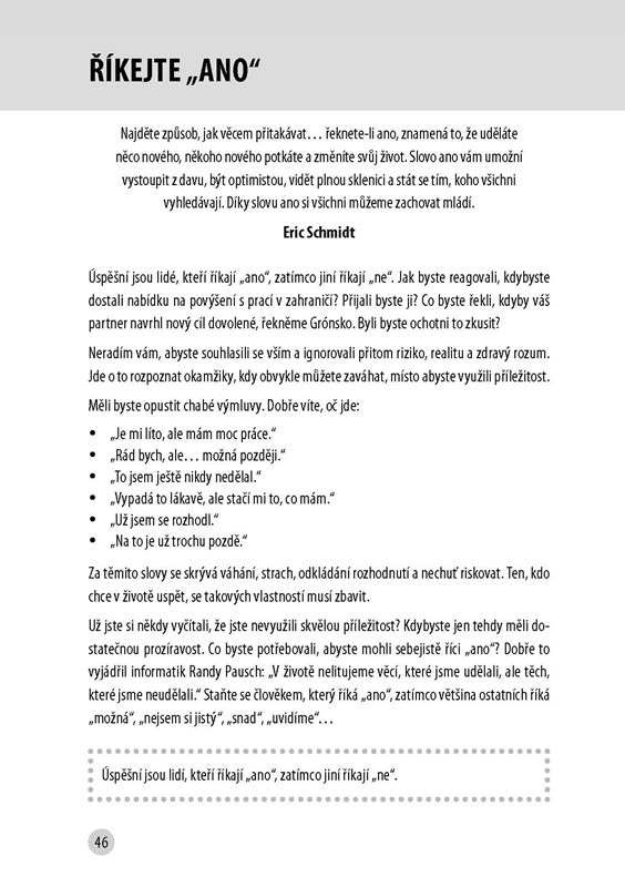 V každé ze sta kapitol najdete jednu novou myšlenku, díky níž se můžete přiblížit svým cílům. Principy představíme a vysvětlíme na první straně. Na druhé straně se pak nacházejí menší i rozsáhlejší cvičení a aktivity, do kterých se můžete pustit ještě dnes. Získáte tak optimální postoje, návyky a způsoby chování, které maximálně zvýší vaše šance na ten váš jedinečný úspěch.