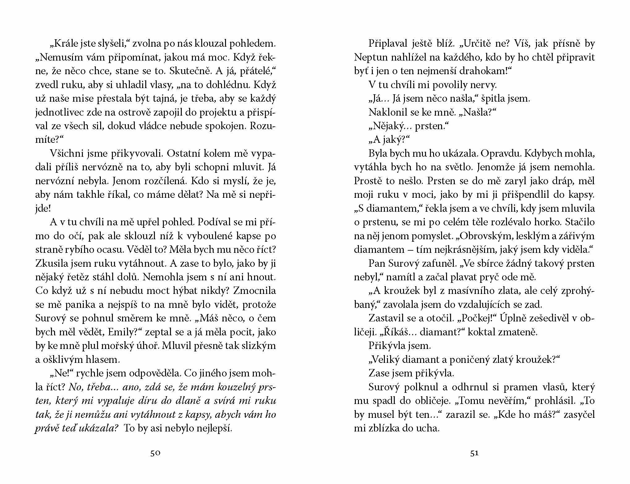 Emily, která se ve vodě proměňuje v mořskou pannu, je ve svém novém domově na tajném ostrově, kde spolu žijí mořští a suchozemští lidé, naprosto šťastná. Jednoho dne však najde v písku na pláži prsten, nasadí si ho a… Neptun, vládce moří, začne strašlivě zuřit. Prokleje ji a z ostrova vyžene. Rozbouřené moře Emily zanese k tajemnému hradu v mlze. Co se v něm skrývá? A proč Neptun tolik běsnil? Co může být na nalezeném prstenu tak zvláštního?