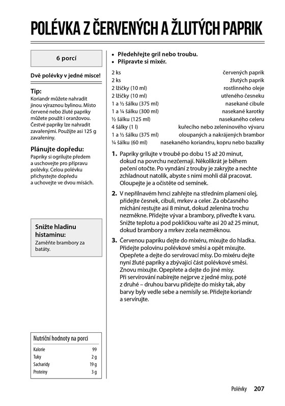 Každý z receptů obsahuje výpočet kalorické hodnoty, podílů živin a tipy na další snížení histaminu v pokrmu.