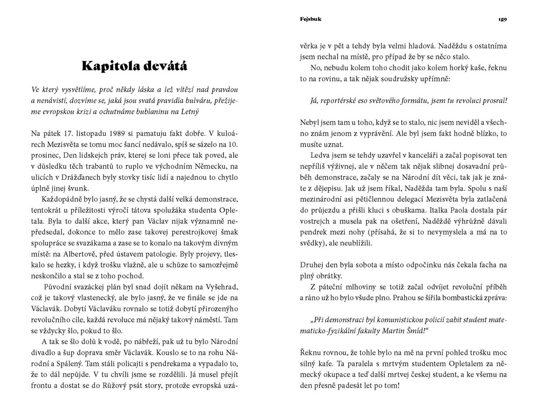 Pražský muzikant a novinář podává výjimečný autobiografický pohled na tuto zemi v posledních čtyřiceti letech. Vzpomínky na Václava Havla i Josefa Škvoreckého se mísí s pátráním v komunistických archivech i svědectvím z dob revoluce a budování kapitalismu, aby se nakonec spojily v ryze osobní příběh vrcholící v New Yorku na podzim roku 2011.