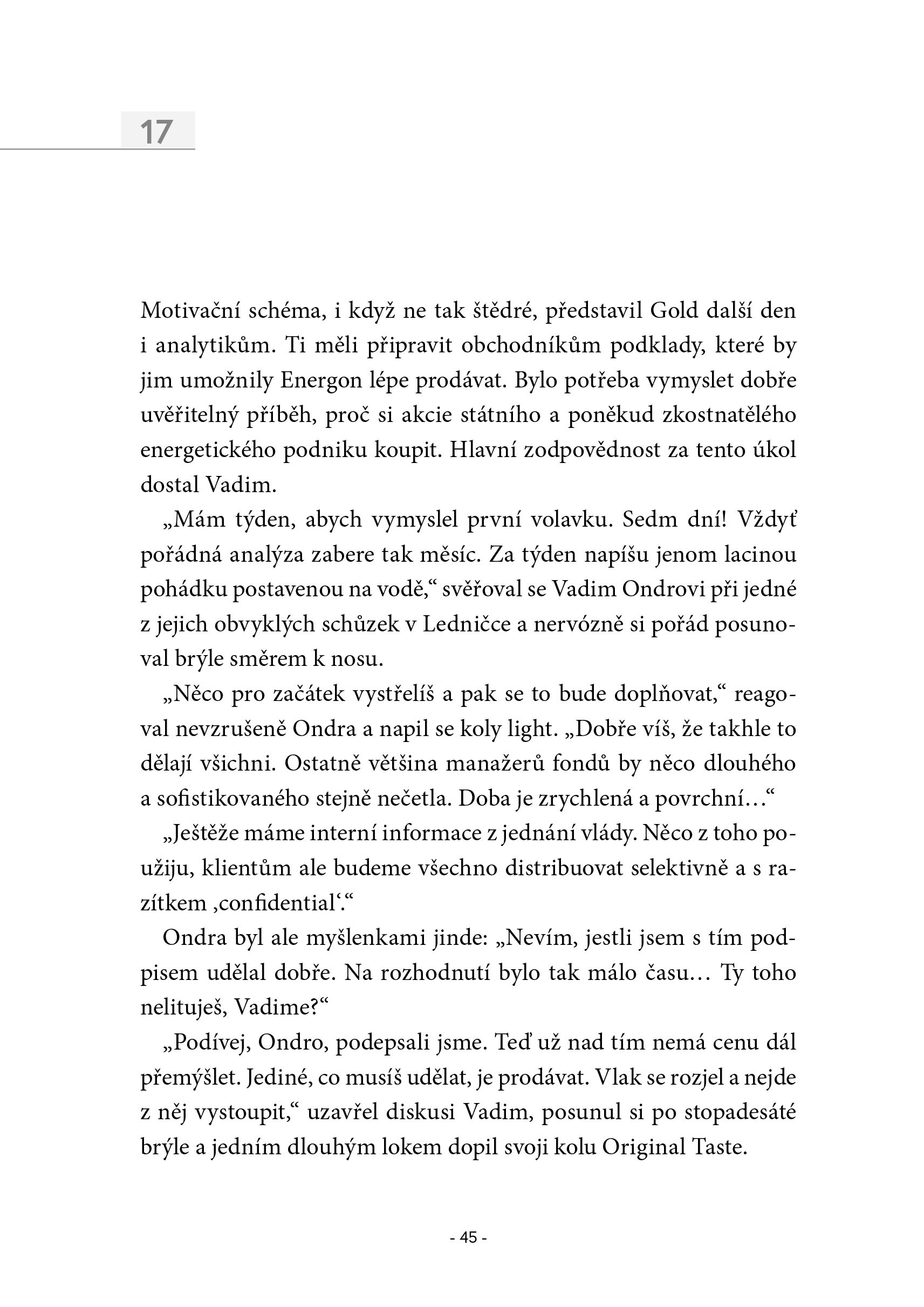 V krátké a úderné knize s krimi zápletkou těží autor z detailní znalosti prostředí, neboť dlouhá léta pracoval u největšího obchodníka s cennými papíry v ČR. Podává autentický a velmi zajímavý pohled do nitra dění na pražské burze.