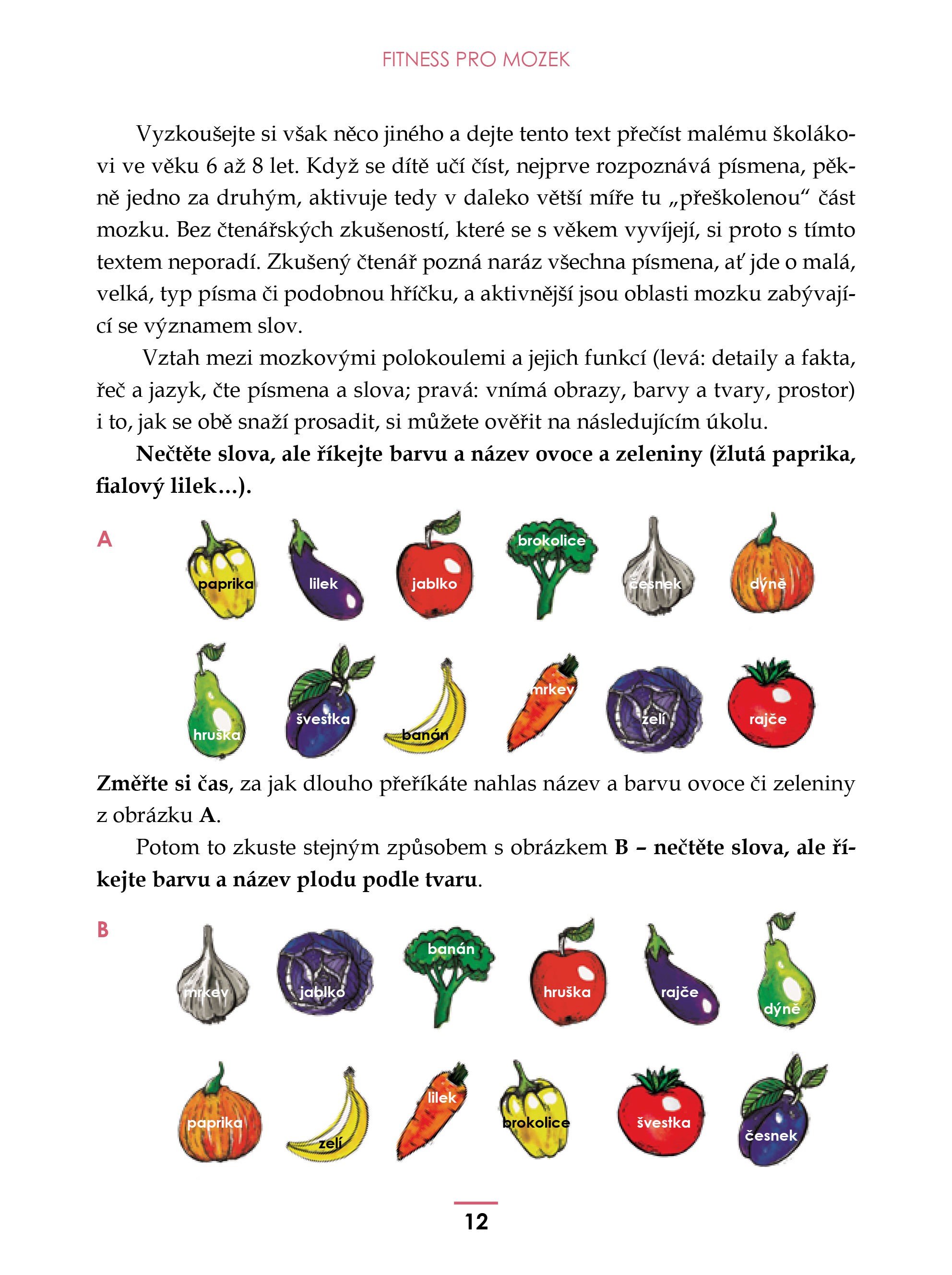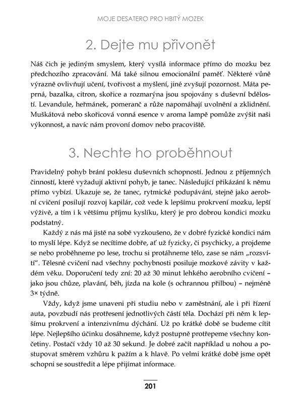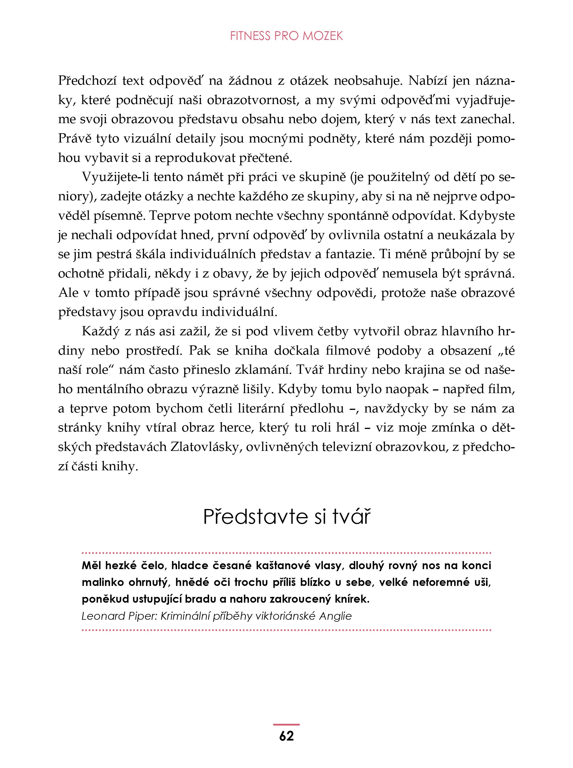 Víte, že kniha je nejlepším přítelem našeho mozku? Čtení je pro něj totéž, co fyzická námaha pro tělo. Vyžaduje zapojení mnoha smyslových, jazykových i paměťových dovedností, které se spojují do specifického neurologického kruhu umožňujícího nám text přečíst a porozumět mu. Na staletími prověřených technikách autorka Jana Vejsadová dokazuje, jak můžeme využít různé dostupné texty k procvičení škály poznávacích funkcí, především paměti a pozornosti. Příklady testů a cvičení využijí děti, dospělí i senioři. Spoustu tipů zde najdou i studenti, například k tomu, jak si doslovně zapamatovat text.