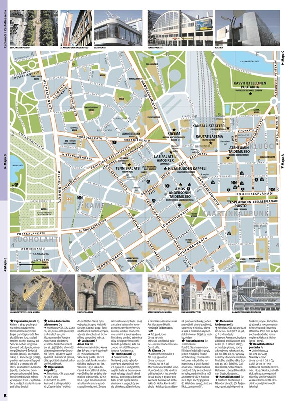 * Unikátní koncept: velká podrobná mapa, rozdělená na rozkládací mapky městských čtvrtí, v nichž vše snadno najdete