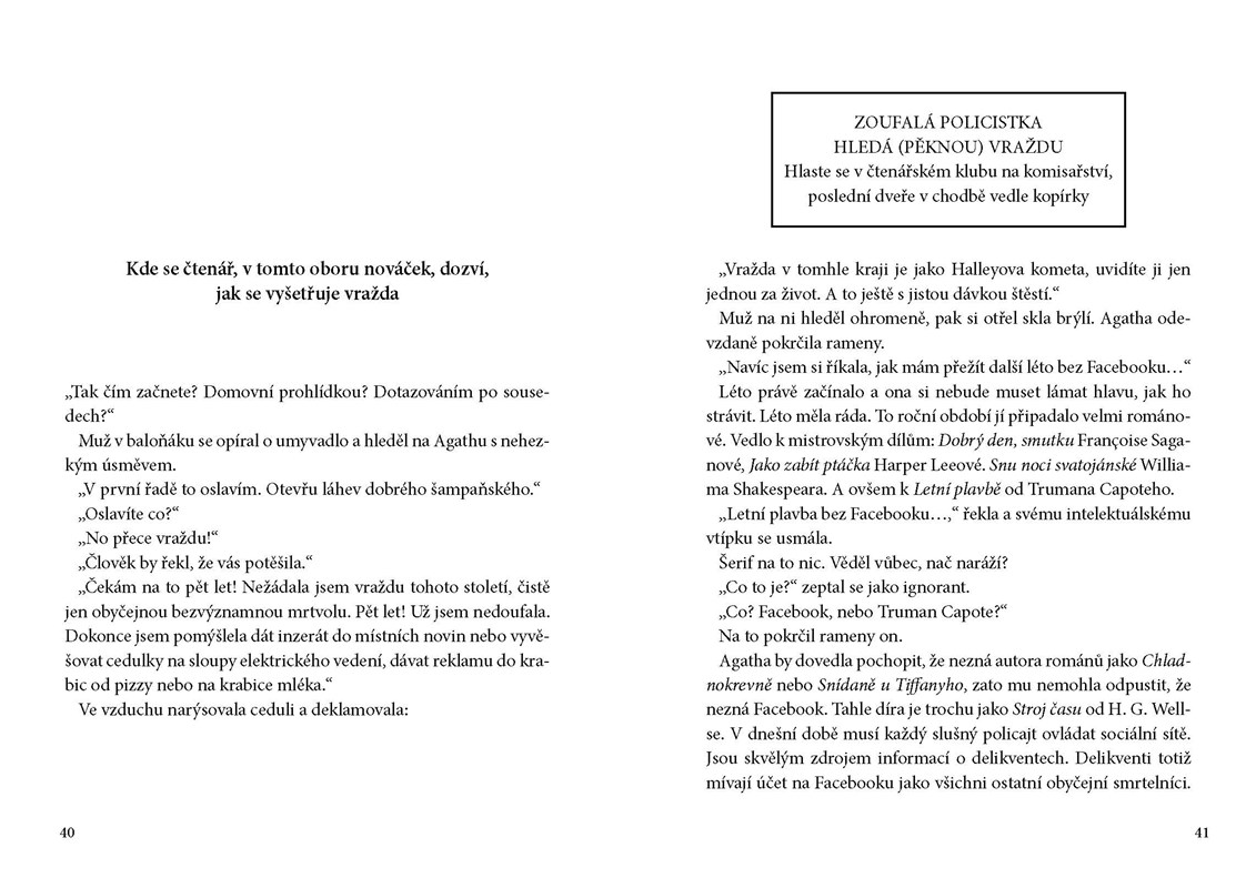 Vražda v tomhle kraji je totiž jako Halleyova kometa. Člověk ji uvidí jen jednou za život, a to jen s pořádnou dávkou štěstí. Toho má ale Agatha víc než dost, a tak se vydává po stopách „koblihového vraha“…