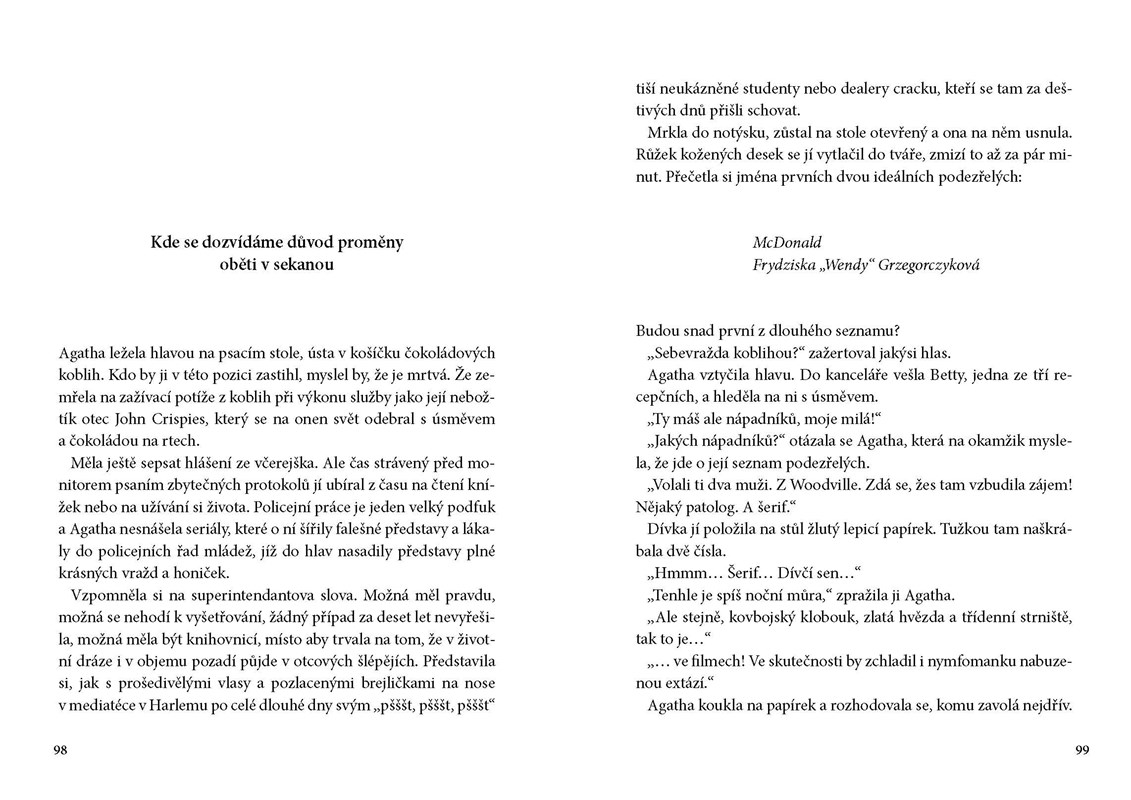 Další léto bez Facebooku. Další měsíce nudy. Mladá Afroameričanka, policistka Agatha Crispesová, žije kdesi v Americe, ve vesnici, ve které je rasismus na rozdíl od internetového pokrytí všudypřítomný. Má skromné přání, vyšetřovat víc než jen úmrtí místní veverky. Zbývá jí jediné: podat si inzerát.