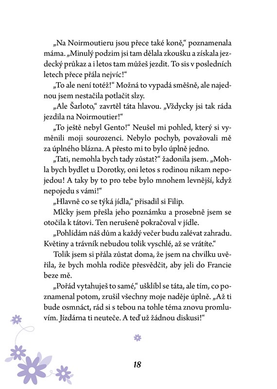 Šarlotě se zhroutil svět. Jezdecká škola prodala koně, o kterého se s láskou starala, a tak zažívá ty nejsmutnější prázdniny. Do stájí už nevkročí a nechce jet ani na rodinnou dovolenou na francouzském venkově. Nakonec ale na sluncem zalité pláži neodolá a užívá si jízdy na koni. A pak se to stane. Šarlota potká koně svých snů! Její nový kamarád je ale příliš plachý a vystrašený. Získá si jeho důvěru, aby mohli zažít to nejnebezpečnější dobrodružství?