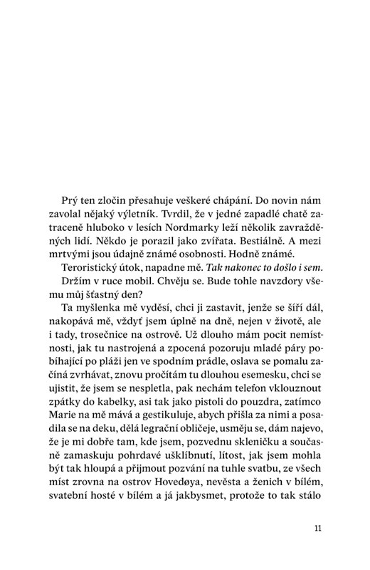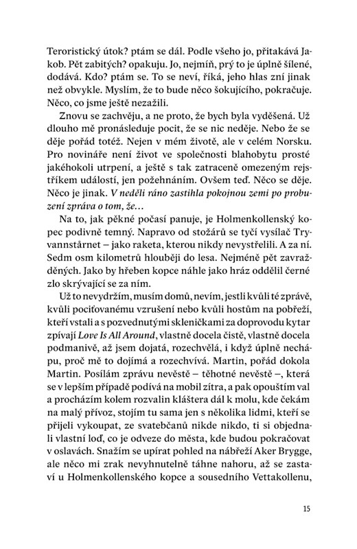 Jednoho srpnového dne roku 2008 je ve své chatě nalezen předák sociálnědemokratické strany Arve Storefjeld. Byl zavražděn – stejně jako jeho dcera a další tři osoby, které tam s ním pobývaly. Ihned se vyrojí řada hypotéz, kdo za hrůzným činem stojí. Celé Norsko truchlí, jen novinářka Ine Wangová, jíž se v posledních letech nedařilo, chytá druhý dech. Konzervativní soudce Peter Malm rozmrzele sleduje emoce, s nimiž celá země na událost reaguje. Jako by se lidé ve smutku vyžívali. Stranou všeho dění stojí bývalý přítel Storefjeldovy dcery Nicolai Berge. Až do chvíle, než ho Ine Wangová požádá o rozhovor.