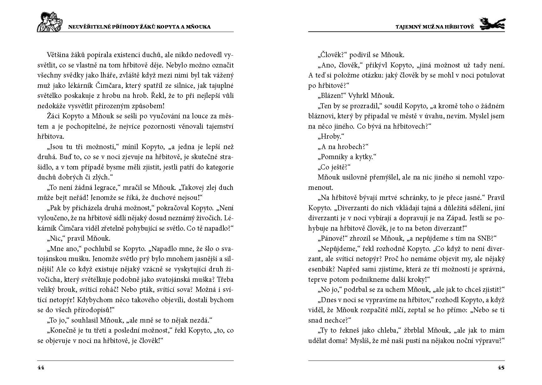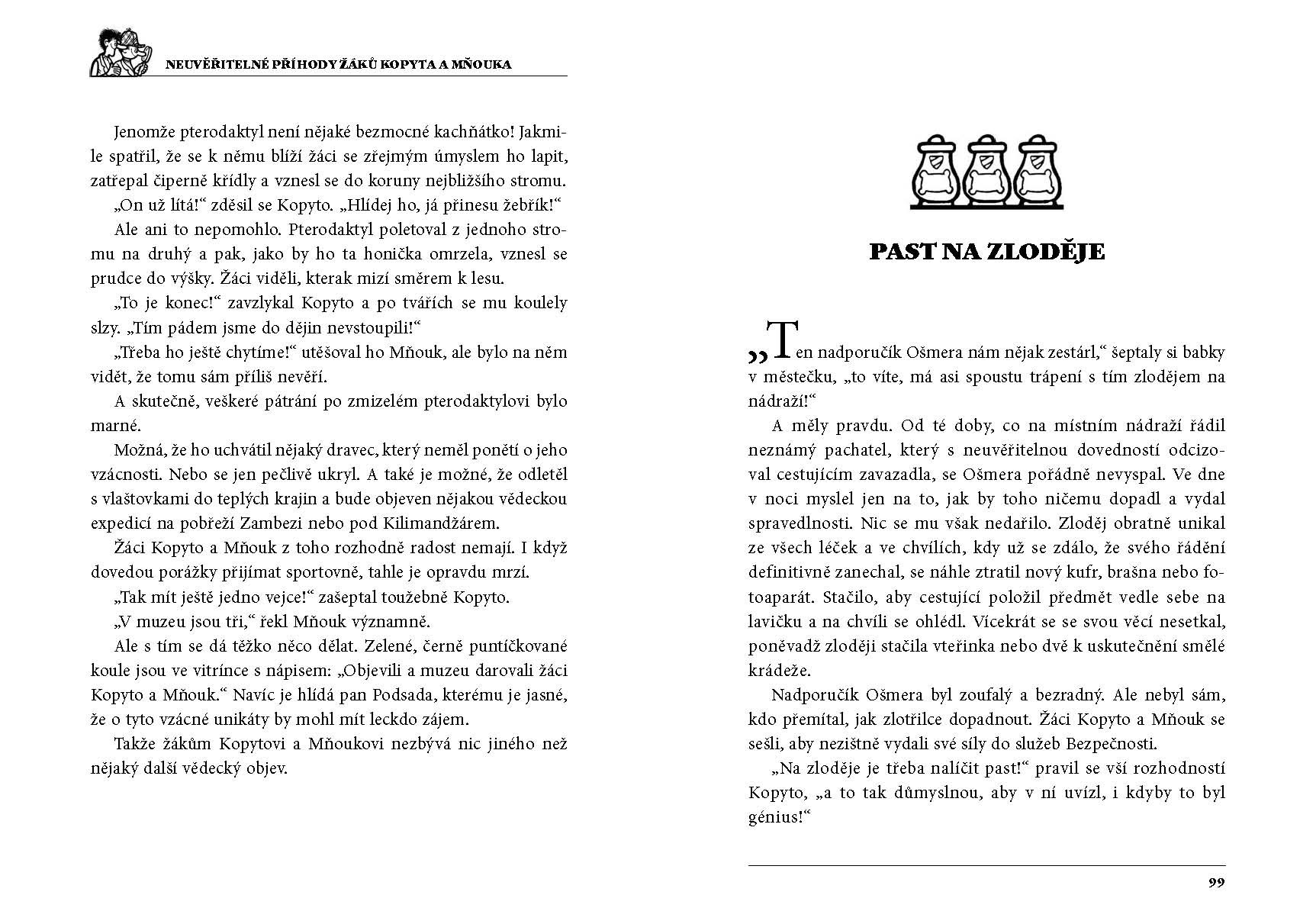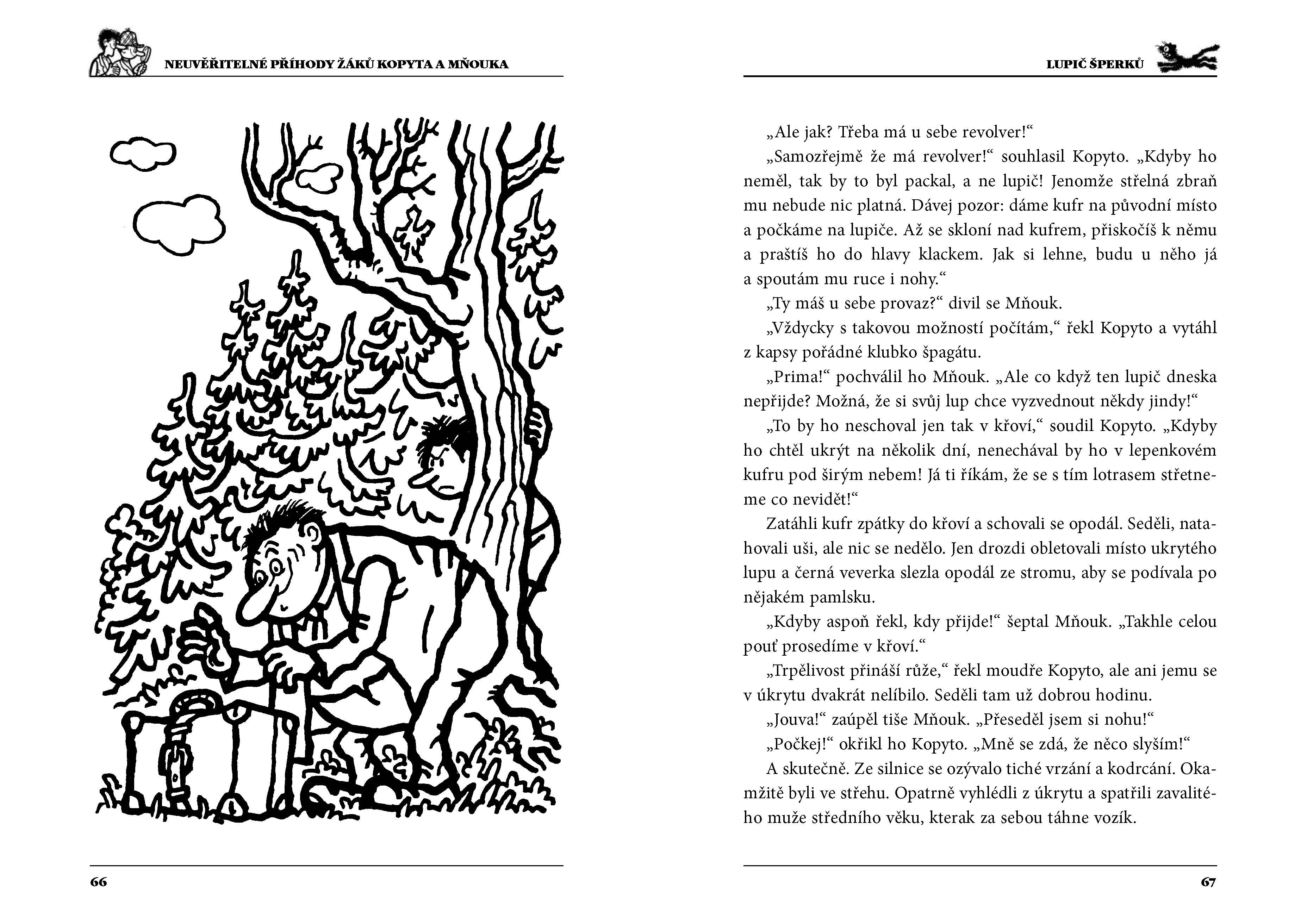 Kdo by neznal žáky Kopyta a Mňouka, dvojici raubířů, detektivů i statečných hrdinů z malého posázavského městečka. Svým důvtipem a fantazií občas zavaří nejen sobě, ale i svým sousedům, učiteli Pěničkovi i nadporučíku a později kapitánu Ošmerovi. Do nejednoho vyšetřování vtáhnou také kastelána Štětku nebo hajného Breburdu. Přes všechny své velkolepé patálie, rozbitá kolena a školní průšvihy jsou Kopyto s Mňoukem vždy na stopě pořádnému dobrodružství. Ať už je vám pět nebo padesát, Švandrlíkovy hrdiny od Sázavy si zamilujete. O to víc, přičtete-li k nim nádherné Nepraktovy ilustrace.