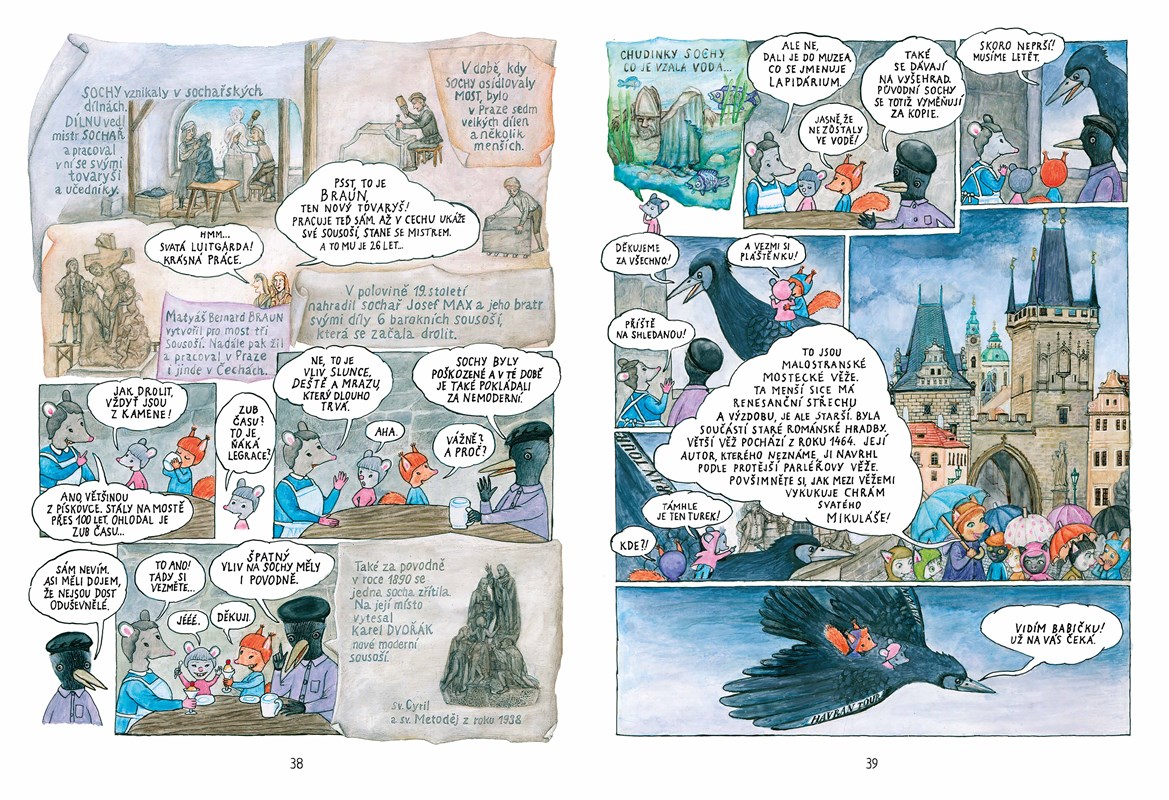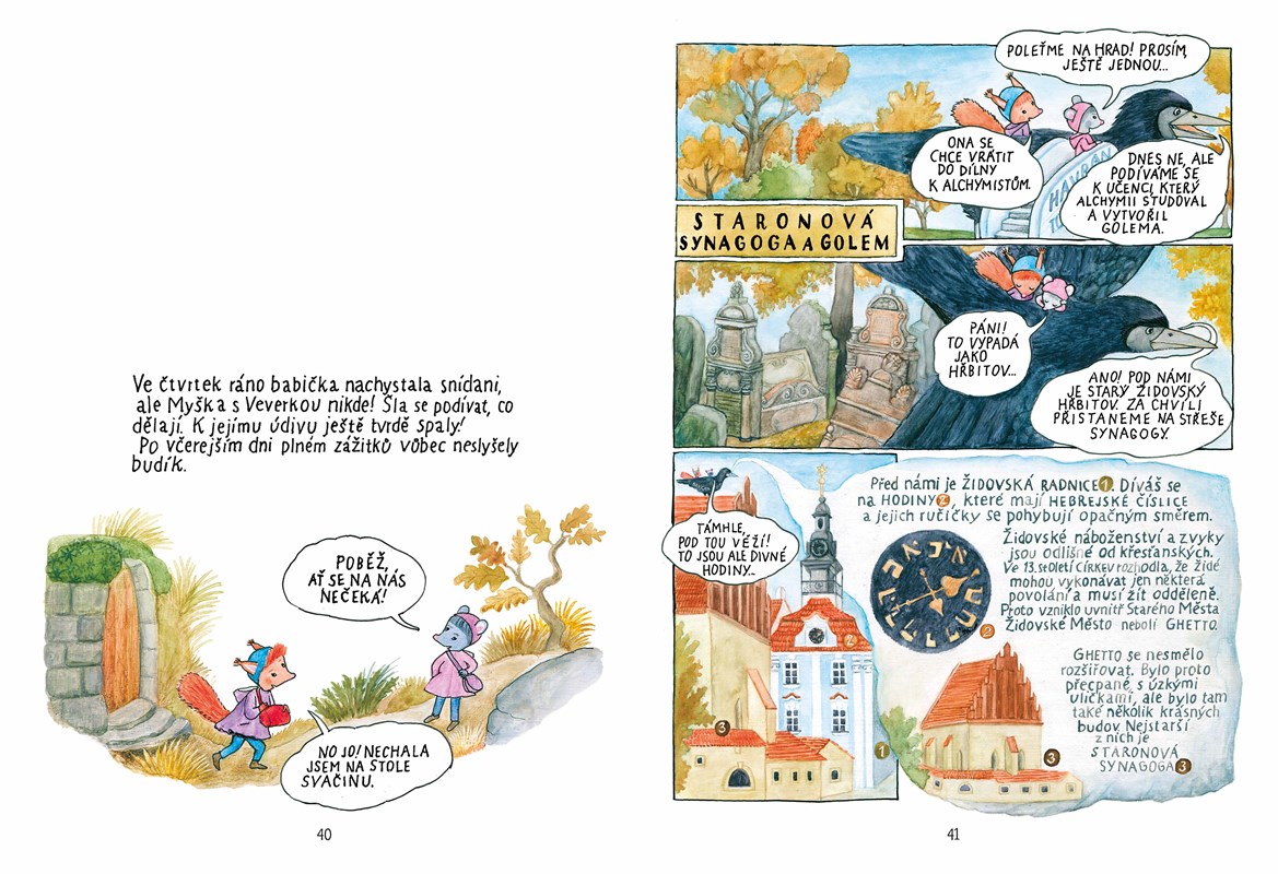 Veverka s Myškou jsou zvědavé a trochu hubaté kamarádky. Vydaly se za babičkou do Prahy a krásy města objevují s cestovní kanceláří pana Havrana. Obletí s ním nejvýznamnější pražské památky, a protože Havran umí krásně vyprávět, stane se z poznávání dějin a architektury úžasné dobrodružství a často i velká legrace. Cestovatelky na vlastní kožíšky zažijí, jak lidé kdysi bydleli a pracovali (navštíví třeba alchymistickou a sochařskou dílnu), a poslechnou si tajuplné příběhy z dávných časů: o Bruncvíkovi, o golemovi, o Faustovi…