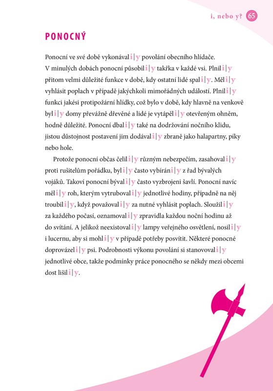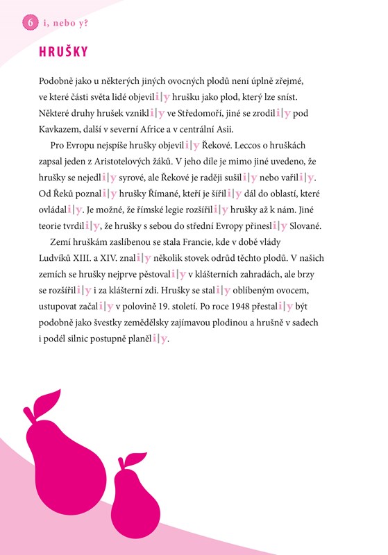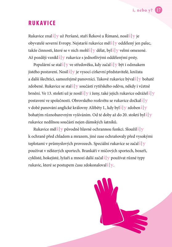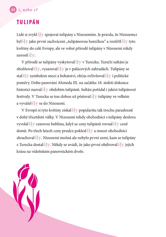 Tak se do toho pusťte… Další svazek Desetiminutovek je tu právě proto, aby vám s tímto pomohl. Najdete v něm spoustu textů o vyhynulých zvířatech, květinách, ostrovech, jídle, sportech, zaniklých povoláních a dalších zajímavých tématech napsaných tak, abyste si při jejich čtení mohli procvičovat psaní i, nebo y ve shodě přísudku s podmětem.