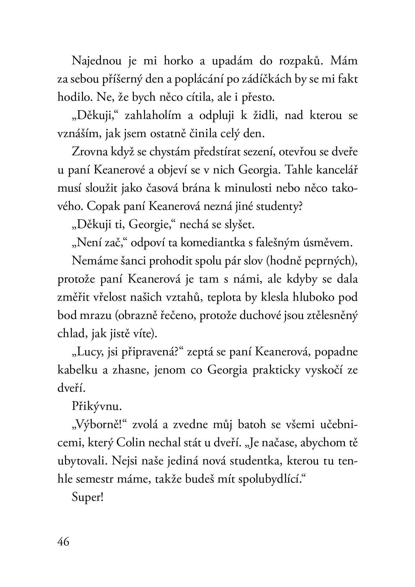 Když se ale ukáže, že v novém prostředí jako osobního průvodce vyfasovala toho nejhezčího kluka (taky ducha), hned se všechno zdá lepší. Ačkoliv se Lucy ještě nestačila pořádně rozkoukat, jedno ví jistě – dostala druhou šanci a nenechá si ji nikým zkazit.