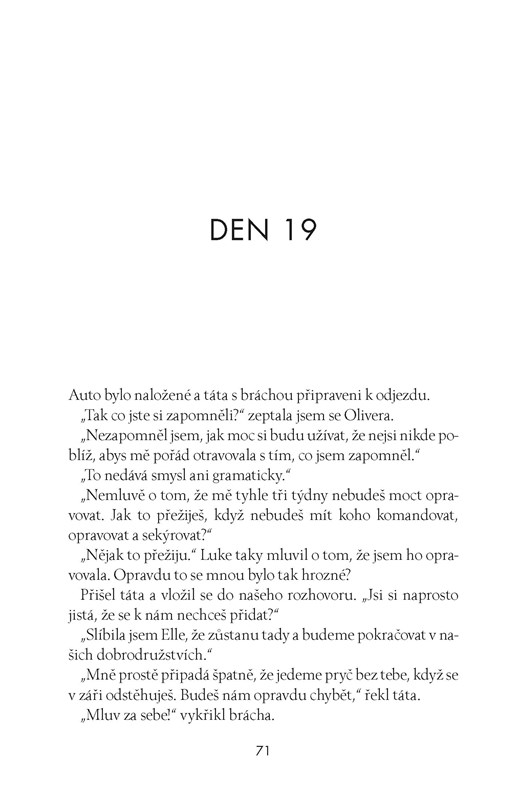 Poslední den na střední škole se dostane Sophie od svého přítele košem. Prý je moc předvídatelná, moc zodpovědná… prostě nudná. Místo aby ji utěšila, jí její nejlepší kamarádka Ella řekne totéž. A to bolí dvojnásob.