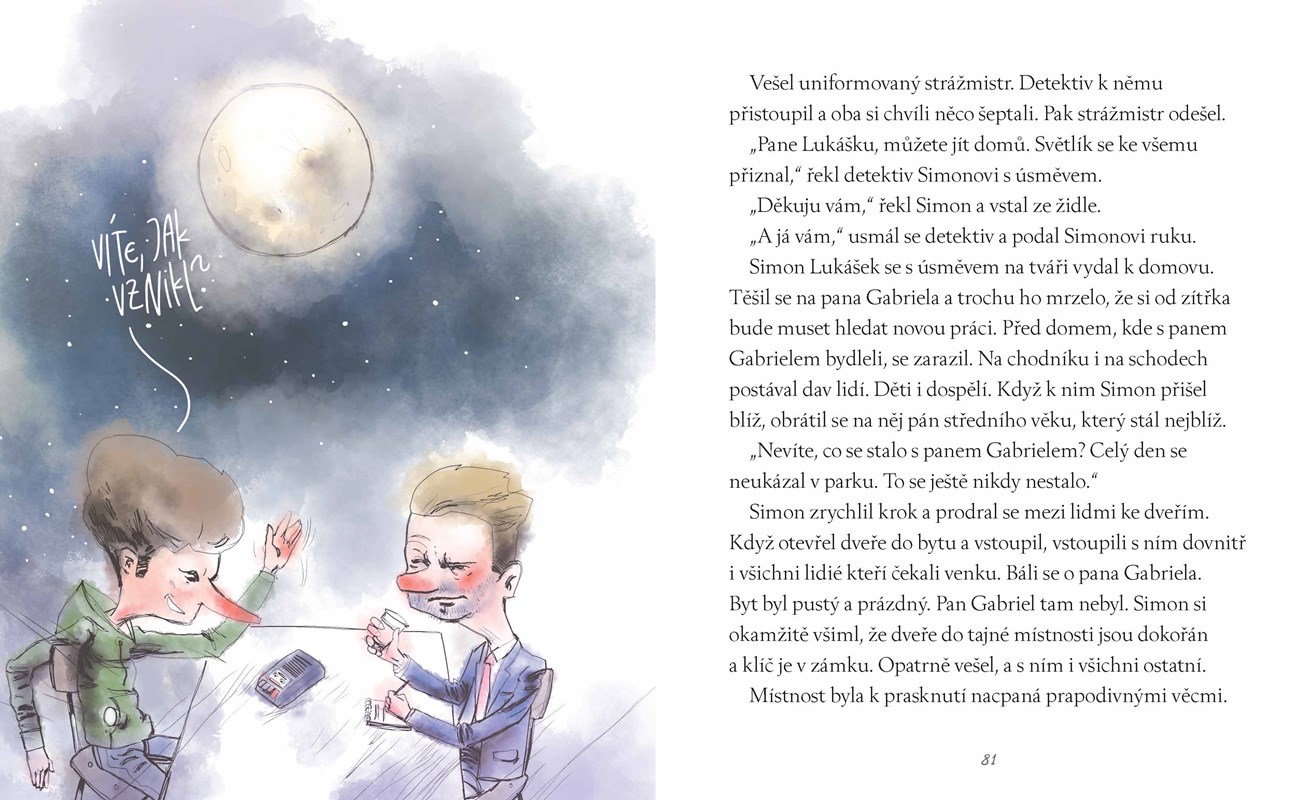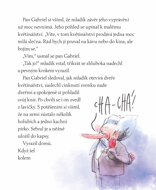 V jednom sousedství žil byl pan Gabriel, v dřívějších dobách obr. Ten každý den chodil do místního parku, kde krmil holuby. A k drobkům starého pečiva přidával i historky ze svého života. Ty byly tak neuvěřitelné, že je lidé z jeho okolí nebrali vážně. To však neznamená, že by se jim nelíbily. Naopak. Pana Gabriela s chutí poslouchaly všechny generace, které do parku chodily. A nejen to. Jeho příběhy posluchačům pomáhaly i v jejich vlastním životě. Brali si z nich poučení, nápady a inspiraci. Byly jeho příběhy pravdivé? Kdo ví…