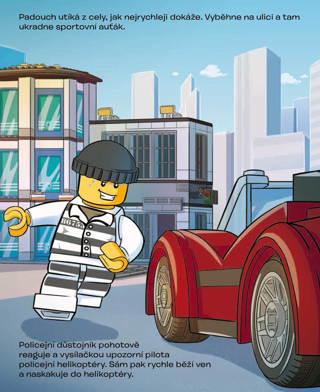 V LEGO® City došlo k vloupání! Zloděj však nesmí zůstat nepotrestán, a tak ho pronásleduje odvážný policista. Dopadne ho a bude padouch po zásluze potrestán? To záleží jen na tobě. Tato knížka ti kromě napínavého příběhu nabízí také jedinečné rozkládací 3D kulisy, v nichž můžeš příběh dohrát, jak se ti zlíbí. Sestav minifigurky padoucha i zloděje, které jsou rovněž součástí této knihy, a hurá do akce!