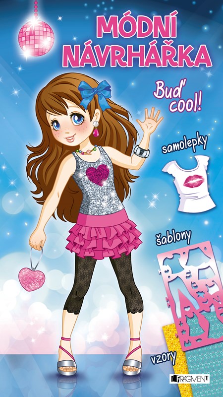 Vyber si vzor látky, přilož šablonu, obtáhni obrysy a vystřihni. Hotové tričko, kalhoty, šaty či doplňky vystřihni a nalep na obrázek modelky. Výsledný outfit dozdob samolepkami a vybarvi.