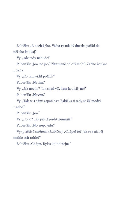 „Čaaau“ nebo „dobrý“ nedbale odpoví na vaše každodenní švitoření, „dobré ráno miláčku, jakpak jsme se vyspinkali“. Prohrábne si rozcuch a když snažíte skrz překvapením otevřenou pusu protlačit výkřik, „a to je jako všechno, co mi řekneš“, přihodí znuděné „a co jako,“ případně „vo co de“.