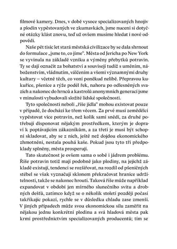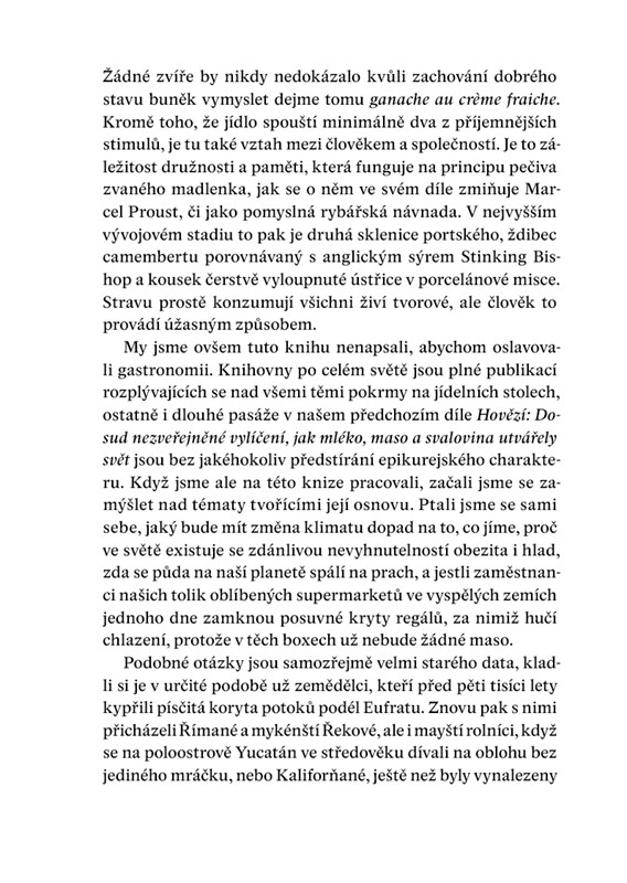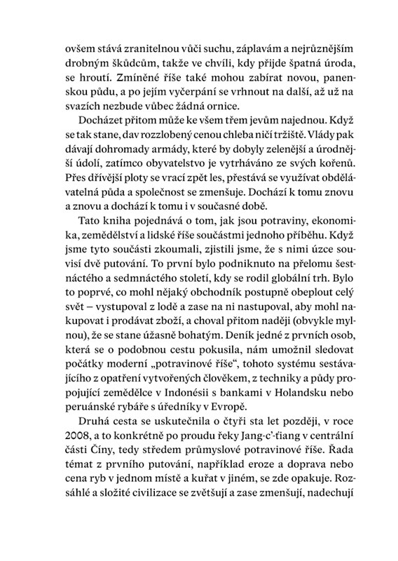 Kniha vynikajícím způsobem popisuje jednotlivé cykly konzumace potravin v minulosti, zabývá se však i budoucností. Líčí například, jak by mohla situace, kdy rybáři lovící krevety v deltě řeky Mekongu vytáhnou jen prázdnou síť,
