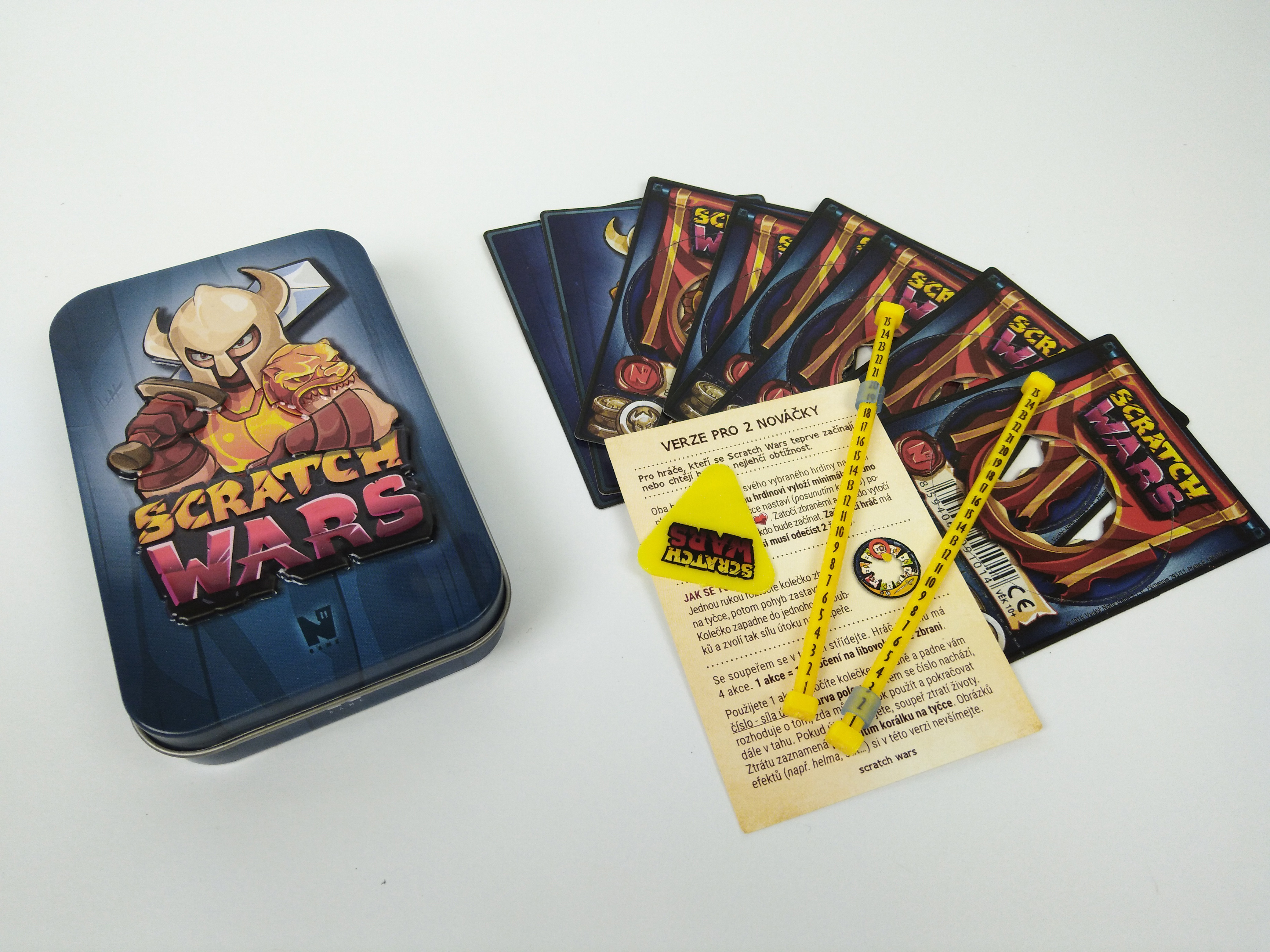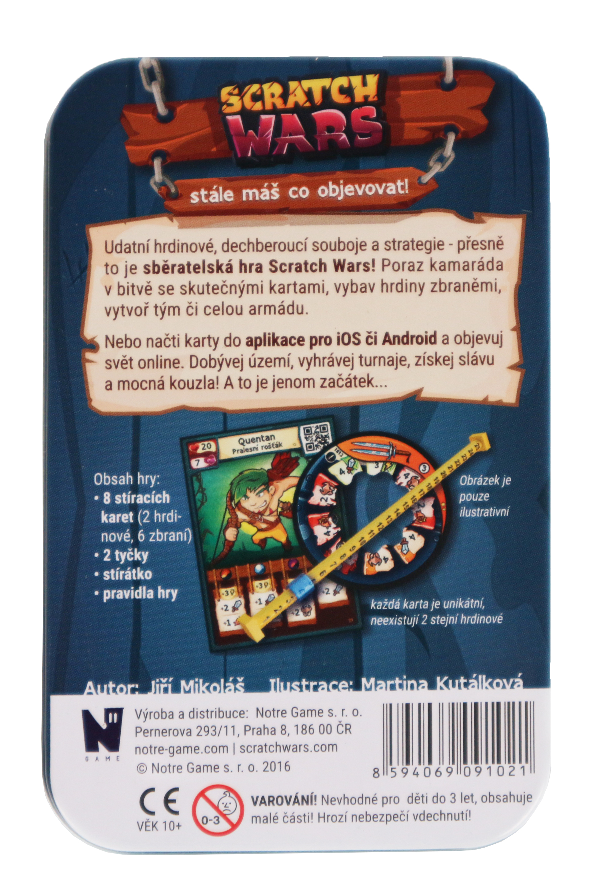 Základní sada jedné z nejpromyšlenějších a nezábavnějších českých her – Scratch Wars. Karty v sobě ukrývají až 40 různých hrdinů a 80 rozličných zbraní z první edice Biolandia/Techlandia. S touto sadou máš dost karet pro sebe i kamaráda a můžete spolu rovnou začít hrát. Poraz kamaráda v bitvě se skutečnými kartami, vybav hrdiny zbraněmi, vytvoř tým či celou armádu. Nebo načti karty do aplikace pro iOS či Android a objevuj svět online. Poraz bosse, vyhrávej turnaje, získej slávu a mocná kouzla! A to je jenom začátek… Obsah balení: 2 karty hrdinů, 6 karet zbraní, 2 plastové tyčky, stírátko, pravidla
