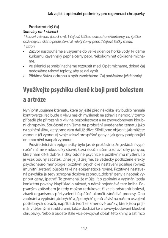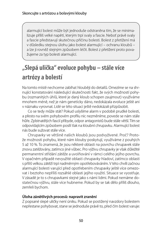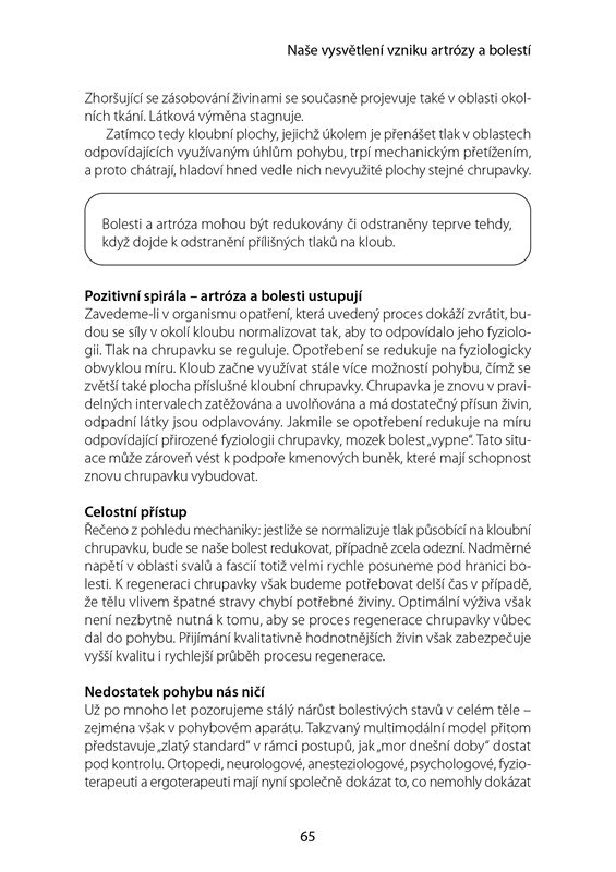 Tato kniha ukazuje, že artrózu můžeme skutečně zastavit a motivuje čtenáře k svépomocným aktivitám. Nabízí vysoce účinný regenerační program doplněný fotografiemi cviků a uvolňujících masáží měkkých tkání, s doporučeními pro vhodnou výživu, včetně několika protiartrotických receptů.