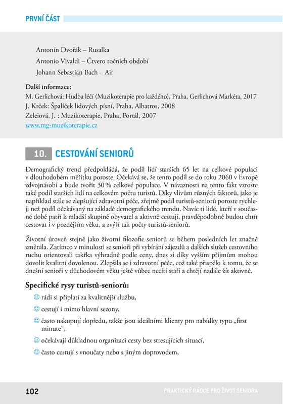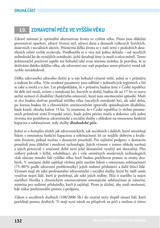 První část knihy tak nabízí zajímavá témata, jako jsou změny organismu spojené se stárnutím, a to výživa a hydratace, trávení volného času, pohybové aktivity seniorů, vzdělávání ve vyšším věku, paměť a její procvičování, cestování, duchovní aktivity, spánek, sexualita či zvládání náročných situací.