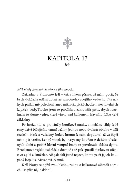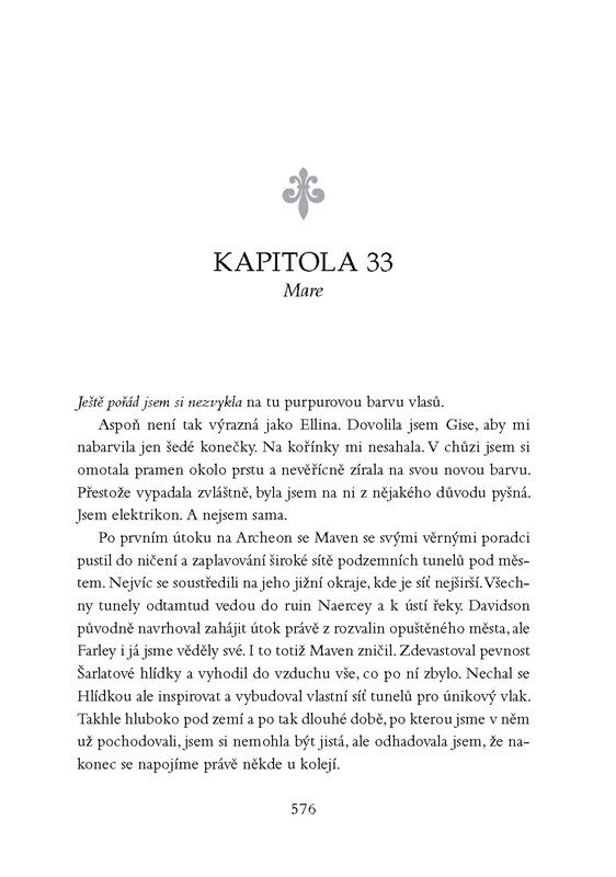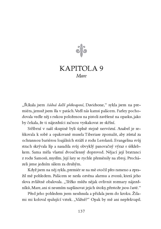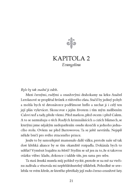 Za každé vítězství se platí. Mare Barrowová to ví až moc dobře. Když ji zradil Cal, málem ji to zničilo. Nyní je odhodlaná bránit své srdce a zajistit svobodu Rudým i novokrevným. Musí zničit království Norty jednou pro vždy… Jenže to nemůže dokázat sama. Nastane čas, aby spojené síly Calových Stříbrných přívrženců a Šarlatové hlídky ukázaly, co umí. Mavenova posedlost Mare je však tak silná, že ho nic ani nikdo nezastaví. Nadchází válka a jisté je jen to, že ne všichni přežijí.