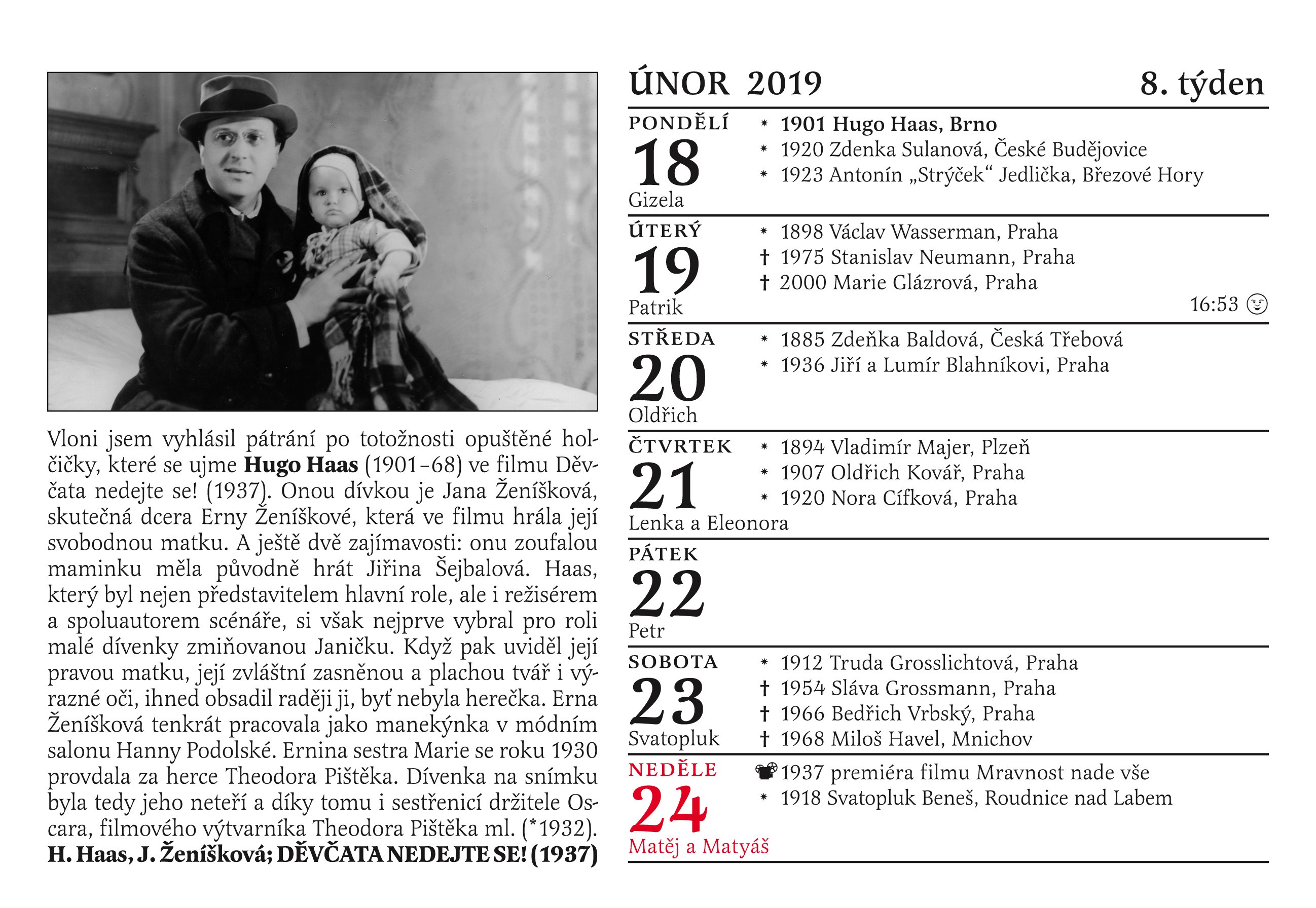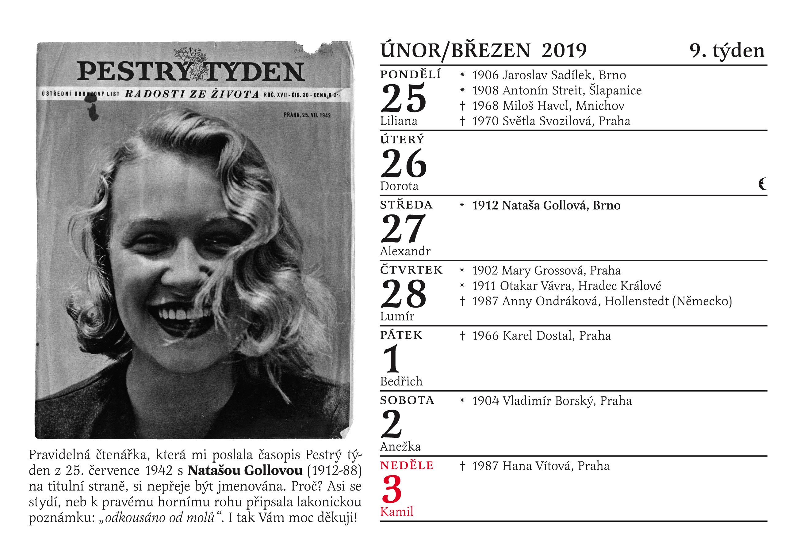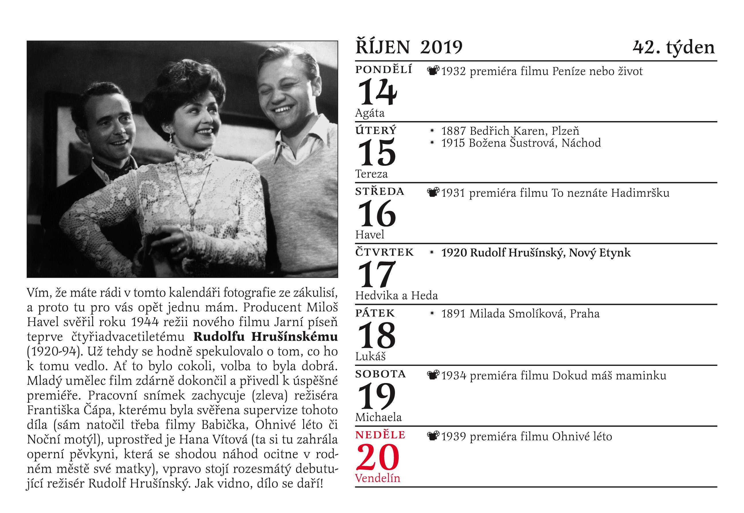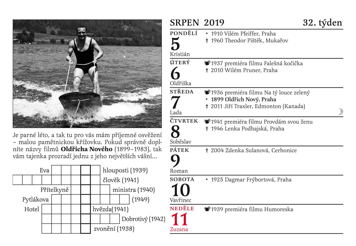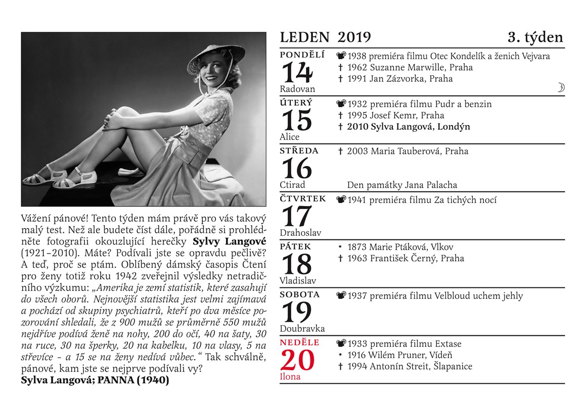 Patří mezi vaše oblíbené herečky Nataša Gollová, Lída Baarová, Adina Mandlová či Věra Ferbasová? Obdivujete herecké výkony Oldřicha Nového, Vlasty Buriana, Jaroslava Marvana, Svatopluka Beneše nebo Karla Högera? Pak si určitě včas obstarejte Cibulkův kalendář pro pamětníky na rok 2019!
