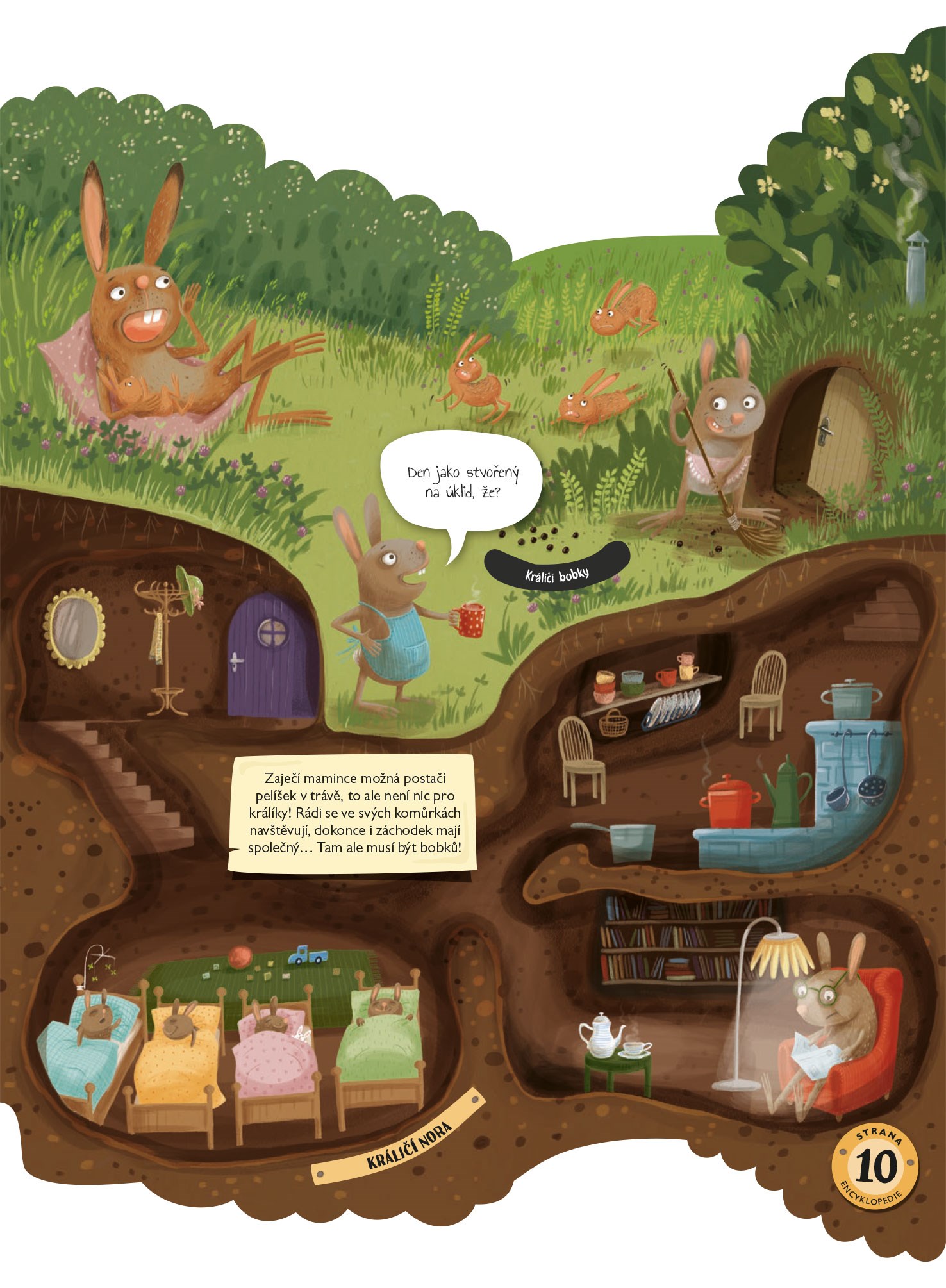 Víte, že rezatá liška je velká nepořádnice a že jezevec je jedno z nejčistotnějších zvířátek, které má dokonce svůj vlastní záchodek? Přesto jsou to sousedi, kteří se často dělí o jednu noru. Nevěříte? Tak s námi pojďte nahlédnout do jejich tajemných domečků a komůrek skrytých pod pařezy a vývraty v hloubce i několika metrů pod povrchem… Budeme se prodírat podzemními labyrinty a navštívíme veselou králičí rodinku, ale třeba i ospalé medvědy v jejich jeskynním pelíšku a nezbedné malé hranostaje v noře zděděné po myškách. Z nádherně ilustrované encyklopedie, která je součástí knihy, se dozvíte další zajímavosti z říše zvířat – například že i obávaný a neohrožený medvěd grizzly se jednomu malému zvířátku raději vyhne obloukem… Tak na co ještě čekáte? Vzhůru do lesních brlohů a doupat!