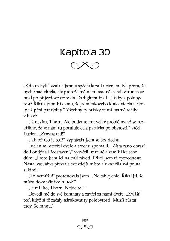 Thorn může sotva dýchat, tělo ji bolí, ze zad jí vychází záře – děje se s ní cosi nevysvětlitelného. A brzy se to má dozvědět: Je napůl člověk, napůl příslušnice národa Stříbrných perutí a zcela nečekaně se ocitá ve smrtelném nebezpečí. Jako polobytost totiž měla být zabita hned po narození. Ještě větší dobrodružství však začne ve chvíli, kdy se dostane do rukou Lucienovi, synovi mocného náčelníka klanu Stříbrných perutí v Londýně. Lucien Thorn učaruje, protože je nejkrásnější bytostí, s jakou se ona kdy setkala – a současně jejím největším nepřítelem.