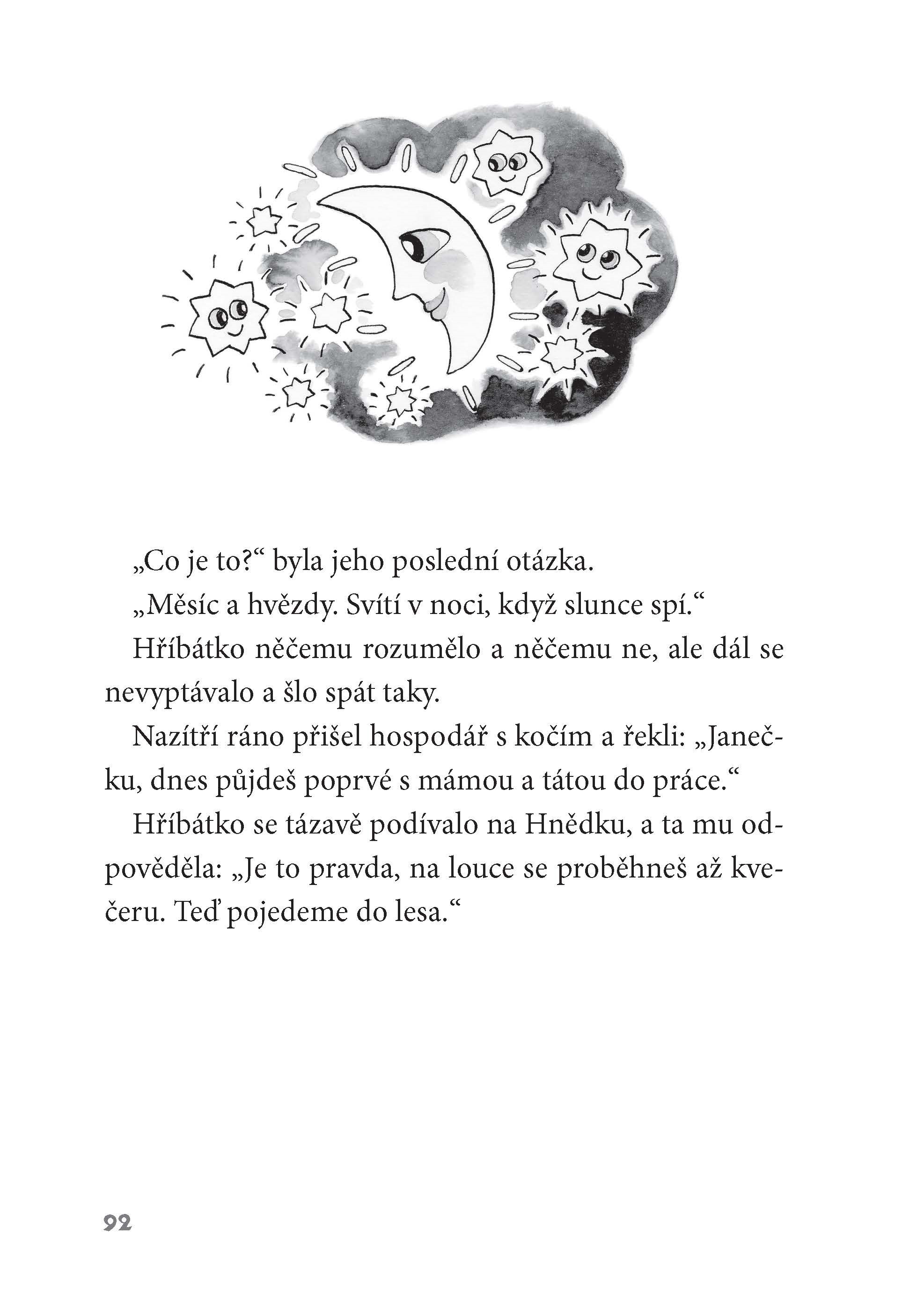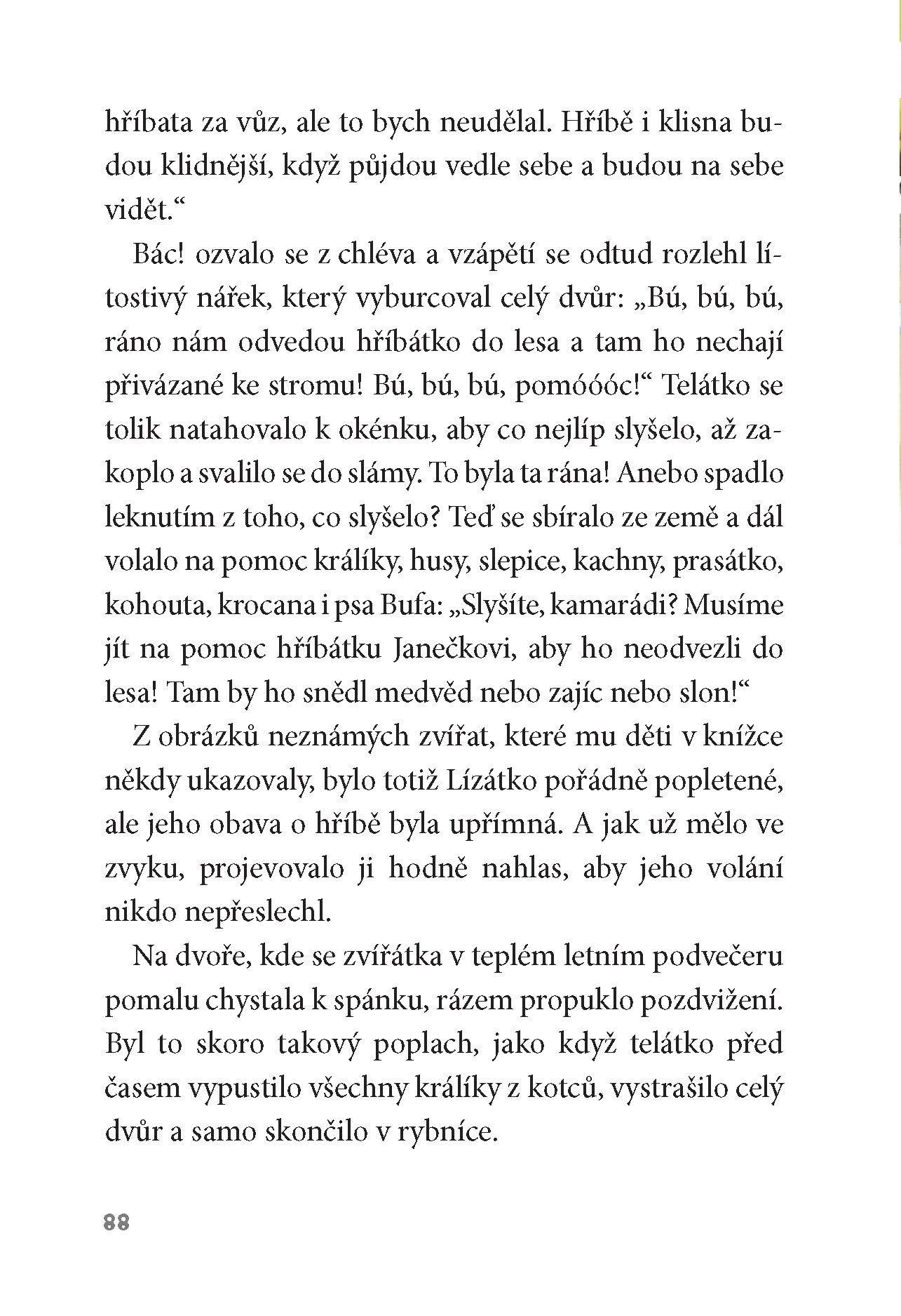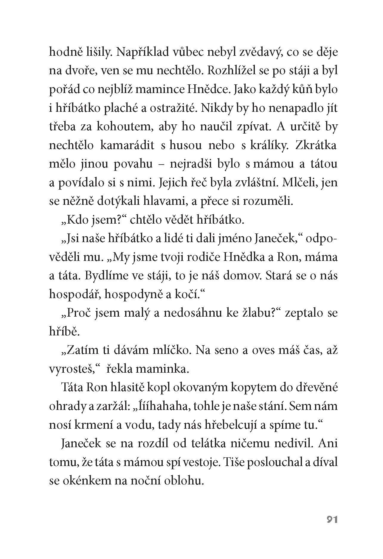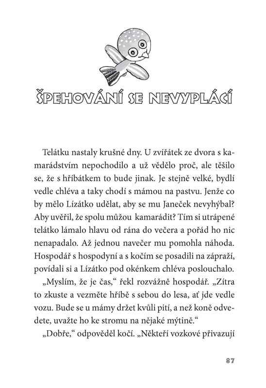 Na konci vesnice stál statek, kde se jednoho dne narodilo telátko. A hned chtělo tohle i tamto vědět a s každým se kamarádit. Zkrátka to byl velký zvědavec! Zvířátka ze dvora se mu však smála, jaký je hlupáček. Když se ve stáji narodilo hříbátko, telátko se těšilo, jak si s ním bude hrát. Ale hřebeček se pořád jen lekal a bál se. Až se přihodilo něco, co všechno změnilo!