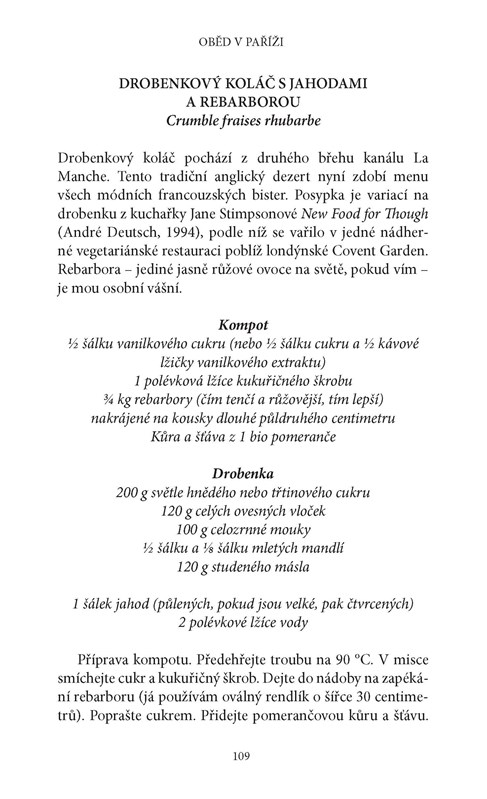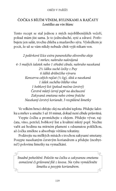 Kniha je okořeněná recepty na vybrané lahůdky, jakými jsou letní ratatouille, tatarák z mečouna, slávky na bílém víně a fenyklu či čokoládové koláčky.