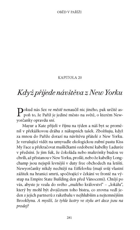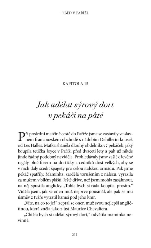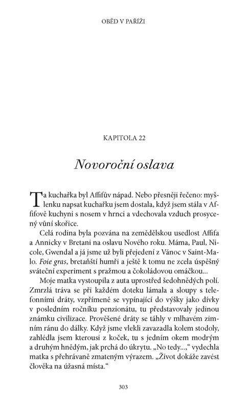 Byla to láska na první pohled? Anebo rozhodlo, jak nádherně jí zajel nůž do pavé au poire a jak se začala růžová šťáva ze steaku mísit s omáčkou z pepře a másla? Lunch in Paris je vyprávěním o tom, jak se mladá Američanka osudově zamilovala, dokázala sama pro sebe předefinovat, co je úspěch, a poznala, co to znamená, když je člověk někde doopravdy doma. Poté, co si Elizabeth sbalila věci, aby začala nový život v nejromantičtějším městě na světě, je vržena do světa rušných tržnic pod širým nebem i elegantních bister. Učí se kuchat svou první rybu (s malou pomocí Jane Austenové) a tišit stesk po domově (za asistence čokoládového koláče). Zakouká se i do místního řezníka (jenž se nebezpečně podobá Mattu Dillonovi). Hrdinka zjišťuje, že čím hlouběji proniká do francouzské kuchyně, tím více před ní začíná sama Paříž odkrývat svá tajemství. Dospívá k poznání, že francouzská kultura se podobá dobře dozrálému sýru – člověk vidí jen svrchní kůrku, dokud se neprořízne k lahodně pikantnímu vnitřku.