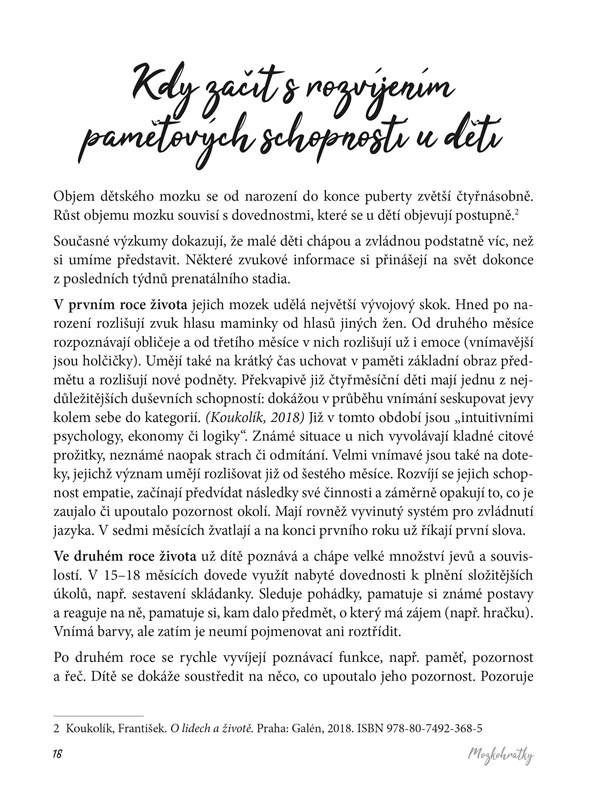 Hra je modelem skutečnosti, a to platí i tehdy, je-li zaměřena na paměť. V knize mozkohrátek pro celou rodinu najdete úkoly v různých stupních obtížnosti, které jsou určeny pro společné chvíle dětí a dospělých. Autorka nabízí náměty, jak si formou hry osvojit s předškoláky i malými školáky paměťové techniky a strategie, využitelné nejen při učení, ale i v každodenním životě. Zároveň přináší rodičům či prarodičům rady, jak nezapomenout, využívat a rozvíjet to, co si osvojili při hře s dětmi.